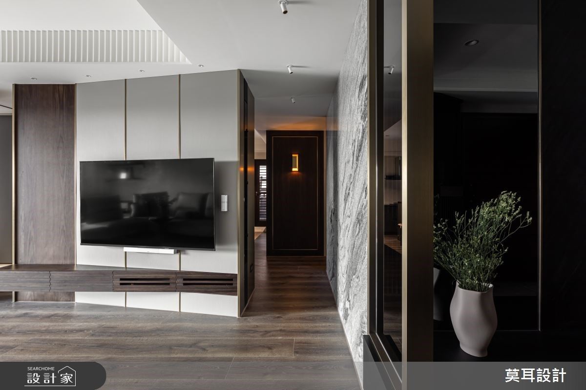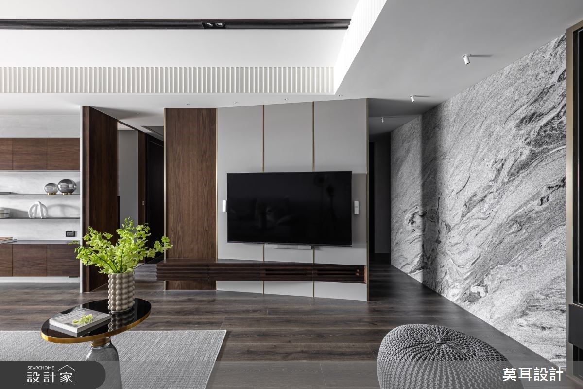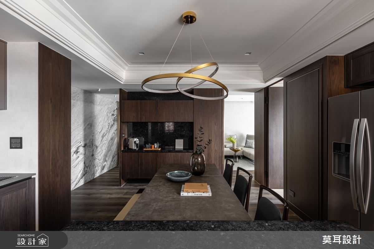45坪現代風,整體空間以深色木紋搭配簡約黑白灰,營造大器恢弘感,入門玄關處擁有穿鞋椅、全身鏡及齊備的收納機能,透過兩種異材質搭配,讓精緻細膩化身居宅空間的第一印象,牆面上的格柵造型使立面輪廓更清晰,律動中的線條無形中引導著入門動線;客廳空間以淺灰色系作為主軸,打造舒適理性的空間樣貌,淺灰地毯、L型沙發作為容納全家人的空間,將歡聲笑語集中於公領域;開放式書桌設置於窗邊,讓閱讀時光也能享受陽光洗禮,牆面上不規則的層架為空間挹注一股活潑俐落感;斜面電視牆以多種異材質提升整體設計感,特殊的斜向設計更貼合居住者的觀看角度;電視牆後方化身餐廳收納櫃,展現牆面完善的雙面機能,回字型動線使屋主一家的生活更加有趣與彈性化,餐桌結合中島作為場域的中心,上方的線性燈飾則為空間挹注精緻流線感,活絡空間意向,其中更是利用牆面打造空間端景,不僅將後方的烹飪區域藏匿於其中,添設暖色光源讓過渡至餐廳領域的廊道,擁有截然不同的面貌與風格,設計師透過自身手法滿足屋主的需求及期待,將原有的四房拆除一房,放大了餐廚空間,讓餐廳區域連結私領域,一家人的情感互動也於無形中凝聚昇華。