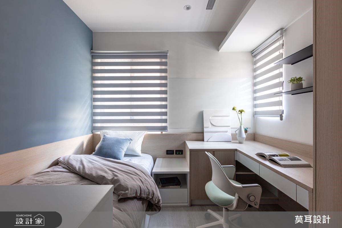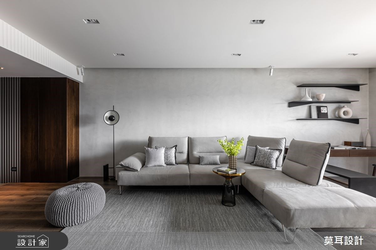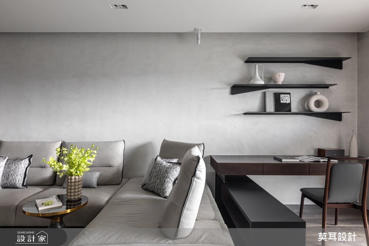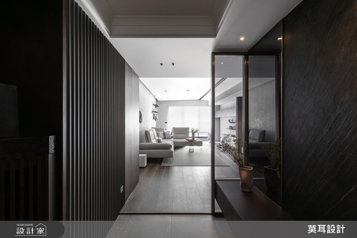 45坪現代風,整體空間以深色木紋搭配簡約黑白灰,營造大器恢弘感,入門玄關處擁有穿鞋椅、全身鏡及齊備的收納機能,透過兩種異材質搭配,讓精緻細膩化身居宅空間的第一印象,牆面上的格柵造型使立面輪廓更清晰,律動中的線條無形中引導著入門動線;客廳空間以淺灰色系作為主軸,打造舒適理性的空間樣貌,淺灰地毯、L型沙發作為容納全家人的空間,將歡聲笑語集中於公領域;開放式書桌設置於窗邊,讓閱讀時光也能享受陽光洗禮,牆面上不規則的層架為空間挹注一股活潑俐落感;斜面電視牆以多種異材質提升整體設計感,特殊的斜向設計更貼合居住者的觀看角度;電視牆後方化身餐廳收納櫃,展現牆面完善的雙面機能,回字型動線使屋主一家的生活更加有趣與彈性化,餐桌結合中島作為場域的中心,上方的線性燈飾則為空間挹注精緻流線感,活絡空間意向,其中更是利用牆面打造空間端景,不僅將後方的烹飪區域藏匿於其中,添設暖色光源讓過渡至餐廳領域的廊道,擁有截然不同的面貌與風格,設計師透過自身手法滿足屋主的需求及期待,將原有的四房拆除一房,放大了餐廚空間,讓餐廳區域連結私領域,一家人的情感互動也於無形中凝聚昇華。
