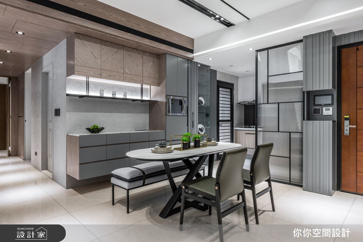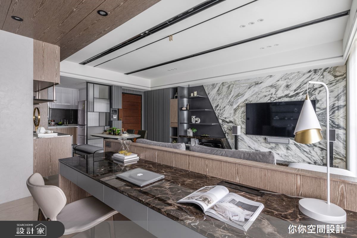 玄關木格柵系統櫃,以中性灰調佐木層板,揭開層次豐富的視覺體驗。由一道圓弧的轉角設計銜接電視牆,以不著邊際的手法打造一體成型效果,同時柔化俐落的黑色元素。電視牆紋理奔放的大理石與金屬質感的黑色噴漆開放收納前,以幾何切割造型展現空間的俐落與大器,襯托落地窗外的光影與景觀,展現生氣勃勃的氛圍。天花板由木質材料包覆修飾,作為空間分水嶺也帶來更多的溫暖。書櫃與廚櫃設計皆以部分開放的方式,減輕過多櫃體的沉重,開放層架的細鐵件與精緻光影,則再度提升層次與質感,視覺也具抬升及輕盈的效果。
