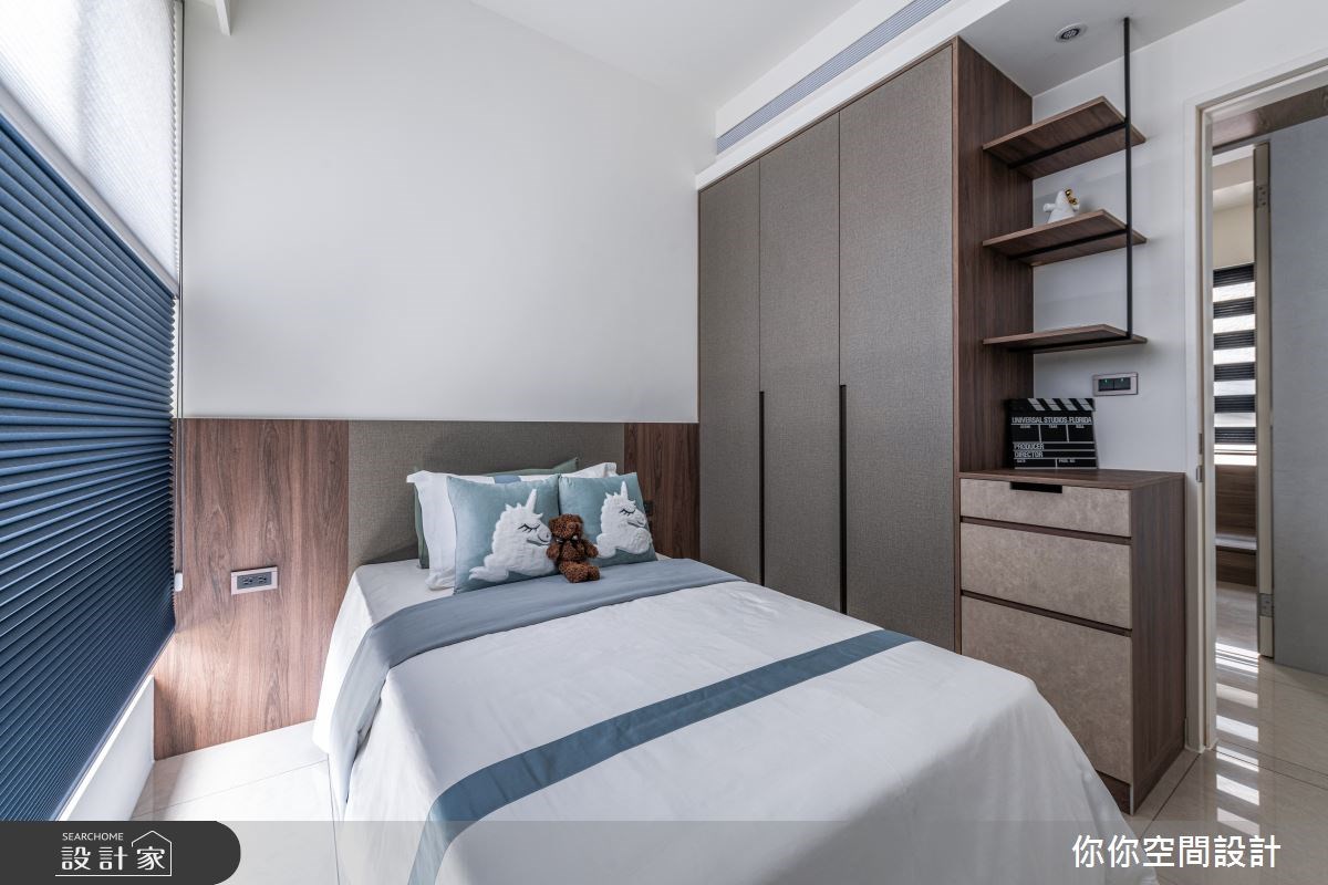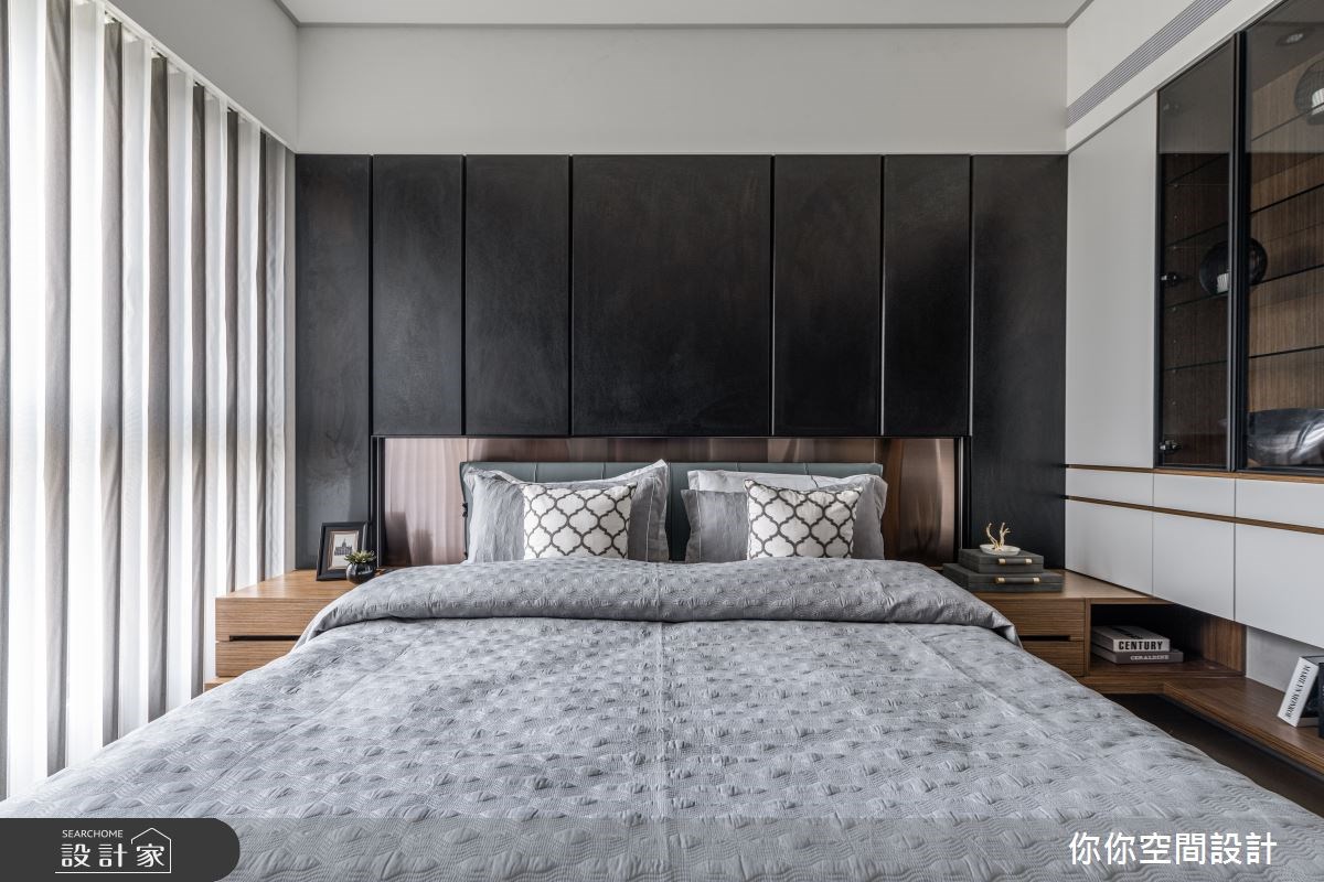 主臥床頭使用黑色皮革,延續黑白時尚語彙,帶出個性氣氛也具備十足的安定沉穩。在寢臥區旁的收納設計選用異材質拼搭,鍍鈦金屬、薄層板、光影設計,營造低調中的享受與奢華。