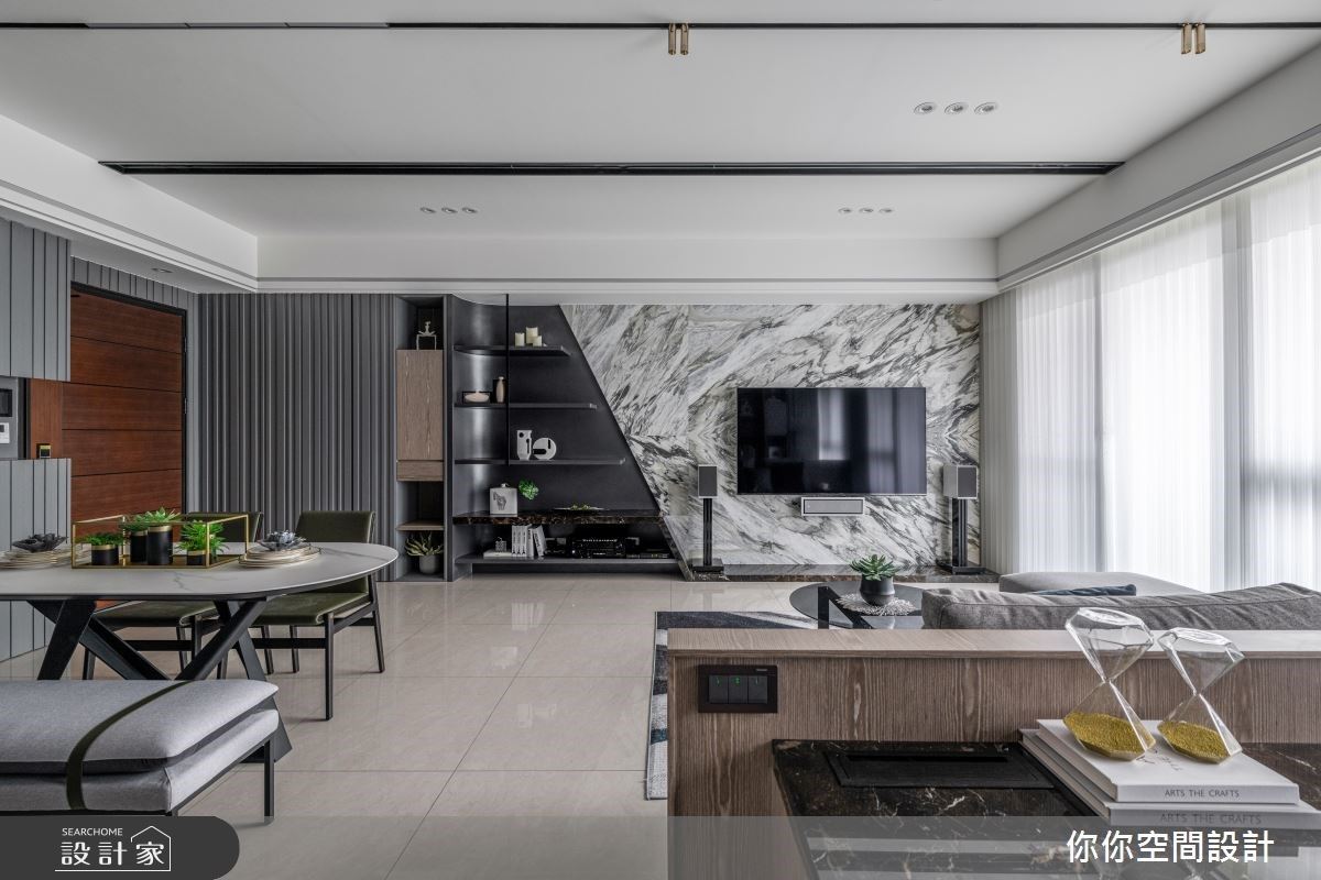 整體以灰黑白搭配自然材質營造內斂優雅氛圍,透過材質與線條的延伸,串聯開放式客餐廳,營造視覺開闊的效果。玄關壁面藉由系統櫃滿足收納機能,銜接開放展示層架,界定空間場域。層架以弧線柔和視覺效果,並選用金屬質感噴漆,營造精緻品味。電視牆大理石藉由幾何造型,紋理自然流動醞釀自然生命力。書櫃延續木紋材質與灰階色調,使整體相襯達到平衡。天花板配合地面以白色為基調,搭配溫潤木皮提升空間協調度,並透過黑色燈飾軌道引導視線延伸,並加入 LED 的環帶設計,建構簡約俐落的空間調性。主臥使用異材搭襯,加入黑色皮革、鍍鈦金屬與薄岩板,呈現沉靜溫潤氛圍。