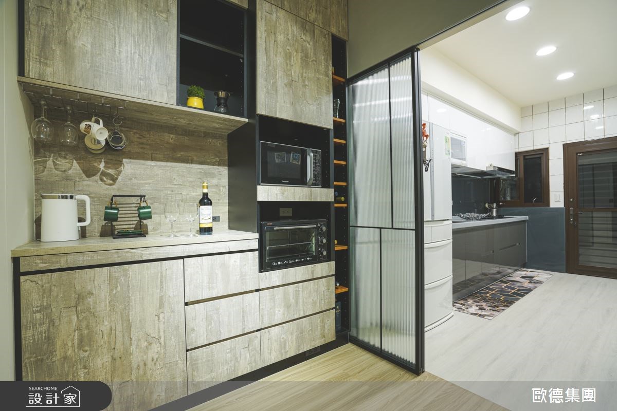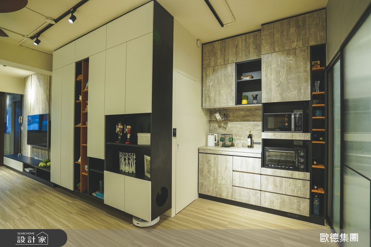 延伸電視主牆的機能櫃,能夠展示屋主的收藏、收納居家雜物,以及整合毛小孩的用餐區和貓砂盆,將坪效發揮得淋漓盡致。電器櫃同樣以系統板材,結合吧台和可調整的零食層架,成功修飾掉尷尬的梁柱,打造美感與機能兼顧的一隅。廚房選擇玻璃拉門相隔,加上次臥兩房門予以調整轉向,並改為隱藏門設計,讓廚房不僅能放大廚具尺寸,還可以新增儲藏室,營造出敞亮又高機能的烹飪場域。