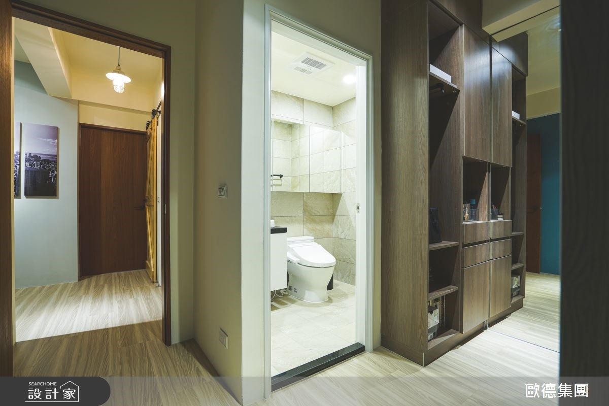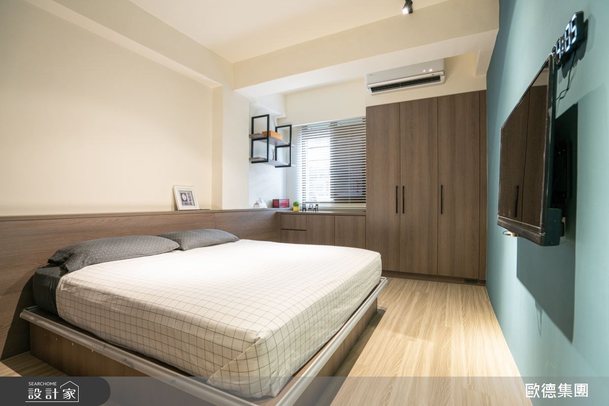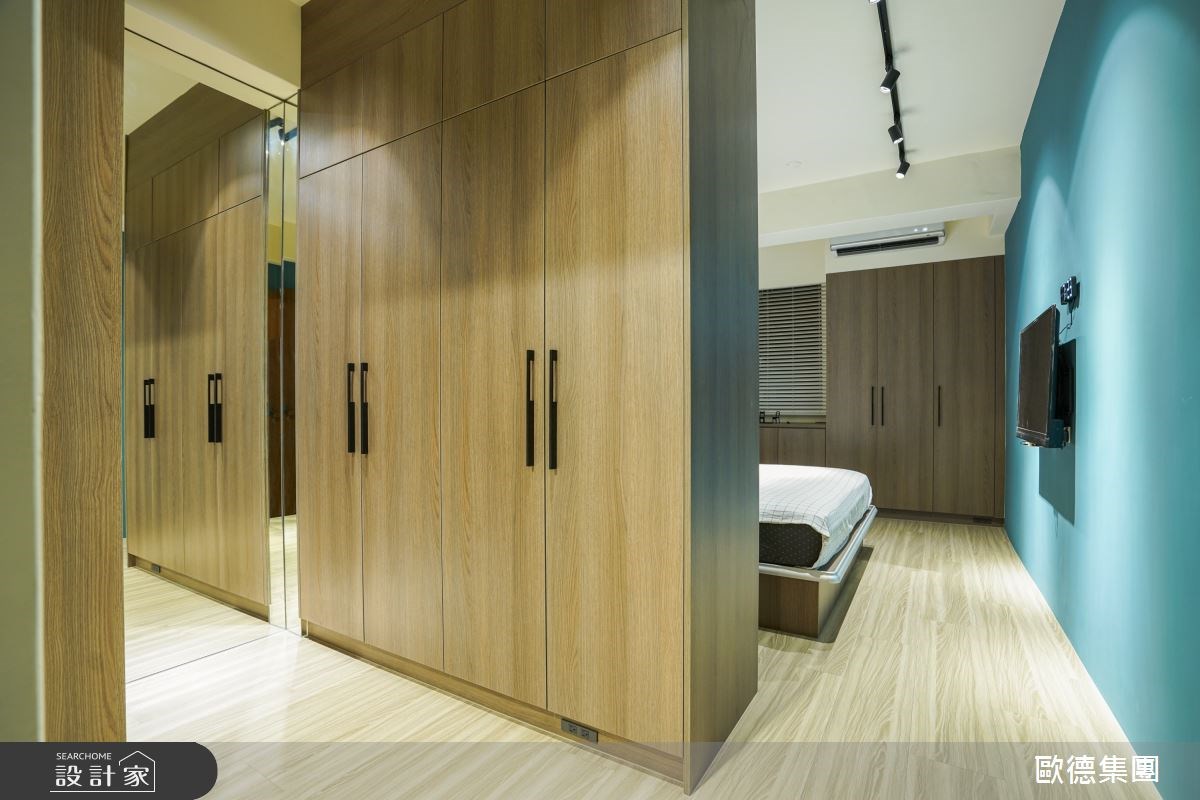主臥以靛藍色點亮空間,且運用木紋系統板材,構成男主人的衣櫃,而女主人的更衣室則特別規劃頂天立地衣櫃,劃分出專屬的穿搭空間,甚至還在廁所旁的角落,利用系統櫃量身訂製女主人的梳化區,完全滿足夫妻倆的日常所需。次臥巧妙地將收納、睡眠及閱讀機能,通通整併為一,讓視覺看起來更為簡潔,貼心創造屬於男孩的私人空間。