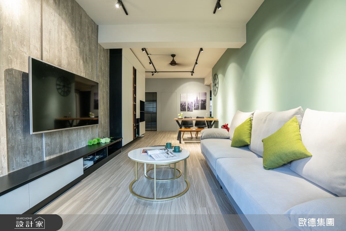 二進式玄關設置一體成形的鞋櫃與穿鞋椅,空間寬裕的情況下,提供貓咪足夠的活動區域,成為牠們的美景眺望台,而夾在客廳和玄關間的落地玻璃門,也使得充足的自然採光,能夠走進開放式公領域。客廳電視牆採取粗獷的工業感板材,搭配橫貫整個天花板的軌道燈,與森林綠沙發背牆相互輝映,形成溫暖又有個性的公領域特質,一走進家裡立即感受到輕工業風的主題內涵。