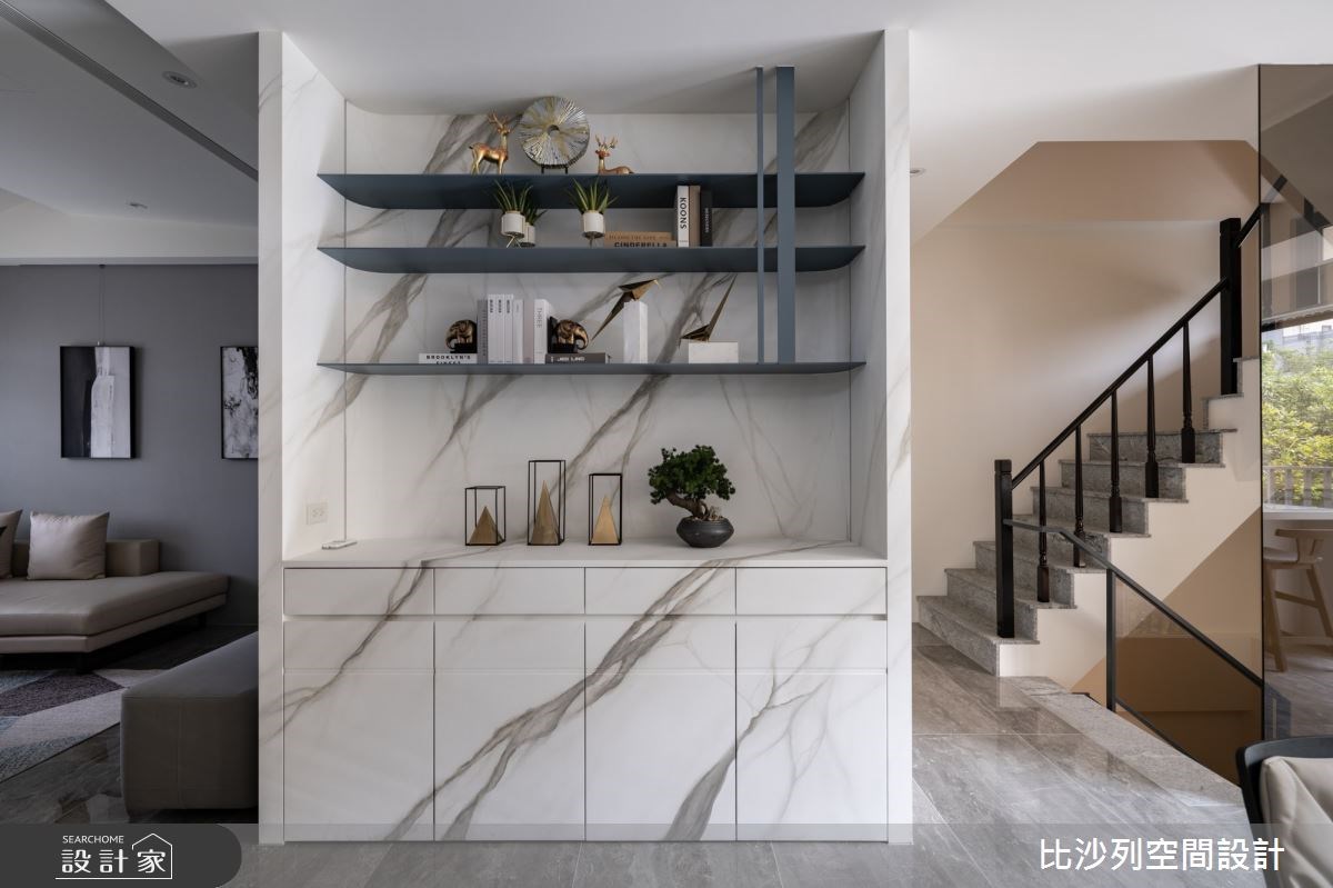 面對窗外的綠意景緻,餐廚空間大方迎接隨風搖曳的樹影,緩緩滲入室內,暈染了吧台檯面、廚具門板及烤漆玻璃,映照出虛實交錯的趣味畫面,同時邀請親朋好友團聚在此,來場前所未有的感官饗宴。而銜接客廳與餐廚空間的過道旁,設置了揮灑大理石紋的藝術品展示櫃,層板的圓弧收邊成就雍容大度的平和之象。