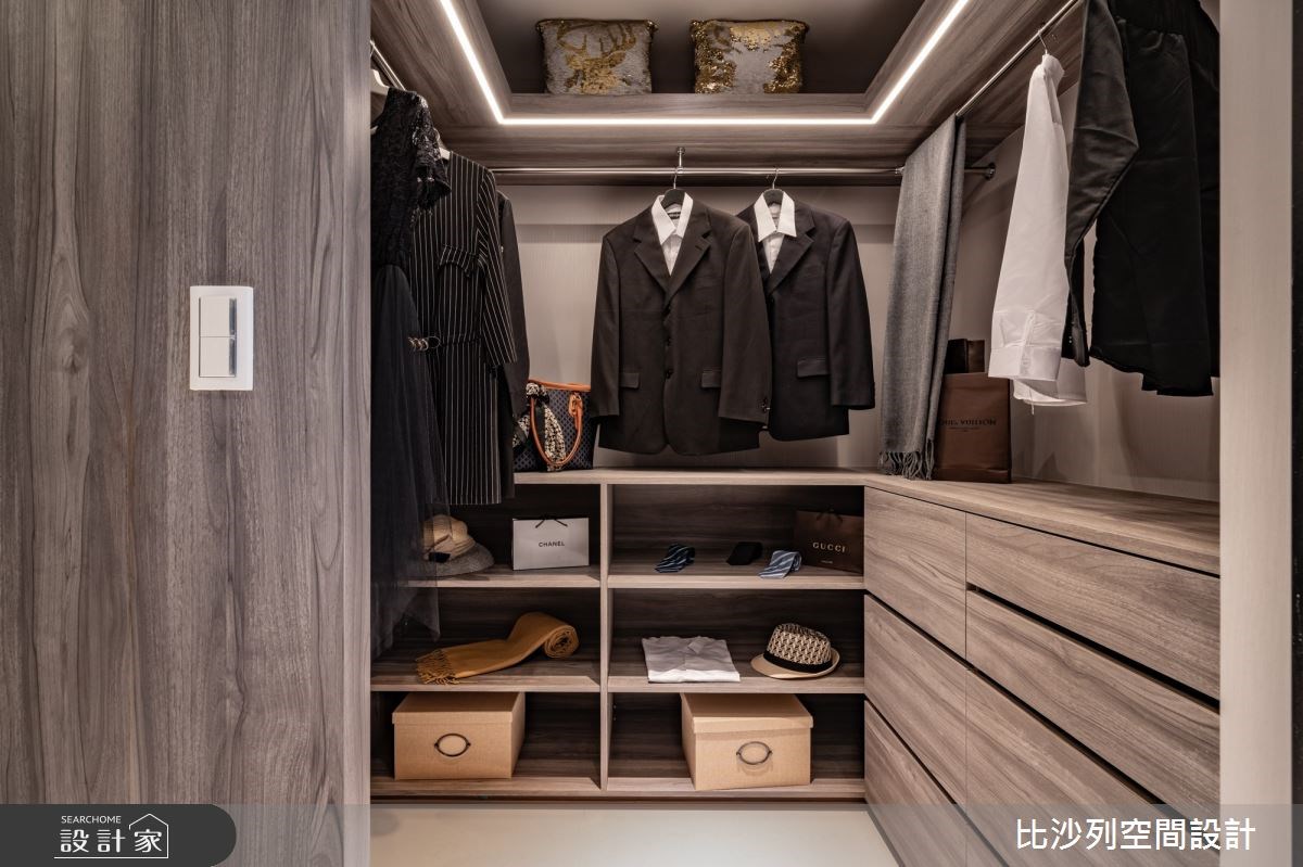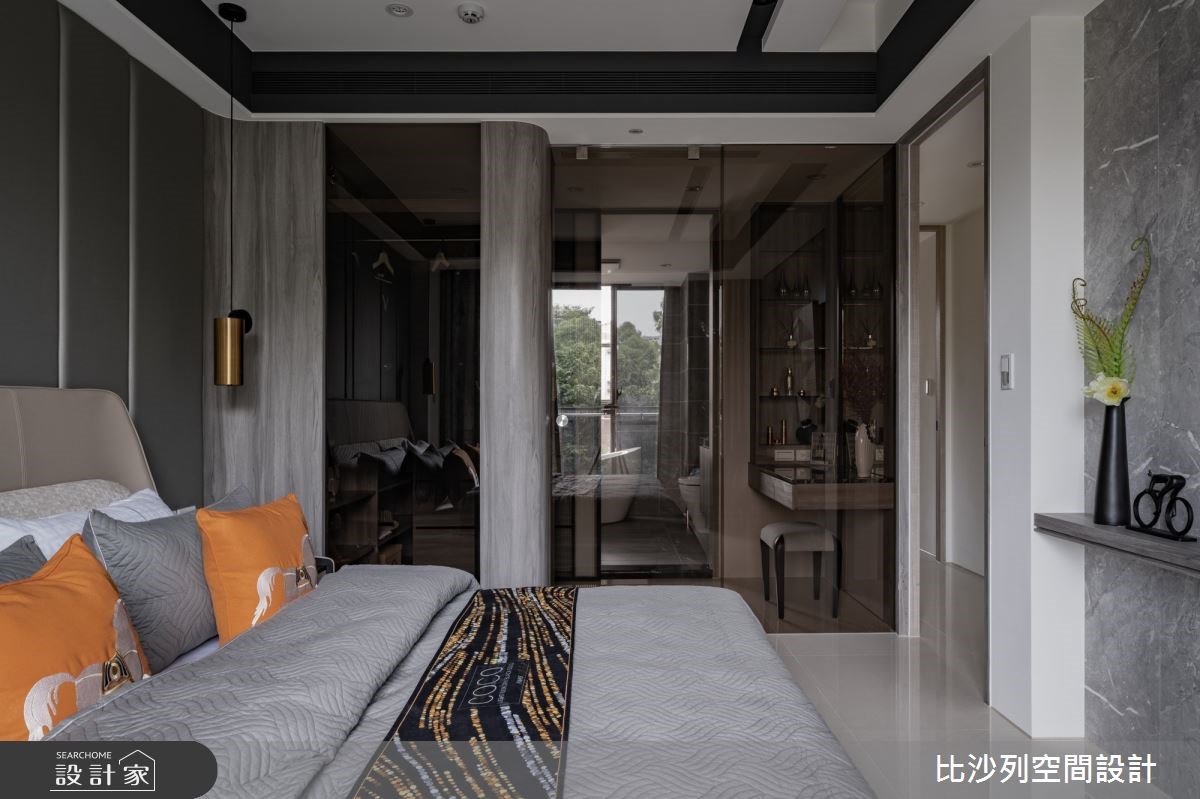 主臥選擇優雅的灰階妝點空間,更衣室、化妝台與衛浴整合於一處,並以茶玻材質與睡眠區相隔,既保持通透感又富有機能。而凸出的更衣室角落,使用導圓角的修飾手法,化解邊角的銳利,細心避免屋主下床走動時碰撞受傷。
