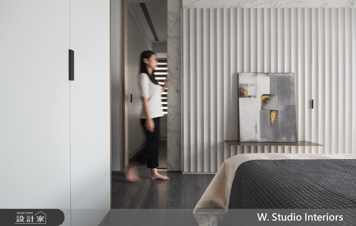 主臥區域,將更衣室、浴廁兩處門扇,利用隱藏式手法整合於同一牆面,化解浴室門對床的風水疑慮;同時透過灰藍進口壁布、灰荔紋染皮等質材,圍塑療癒而放鬆的休憩環境。