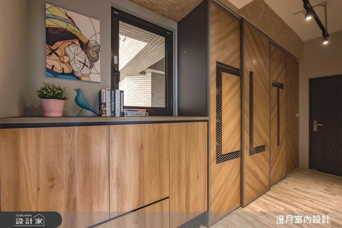 進入玄關處,可以看見一整面的木質置物鞋櫃,超大收納空間是為容納三位女主人各樣鞋款而設計,而門片選擇斜貼木皮開孔夾擴張網,不只可達櫃體的通風效果,擴張網上的英文字母更代表女兒名字的縮寫,三個大寫英文更堅固三人對家的歸屬感。