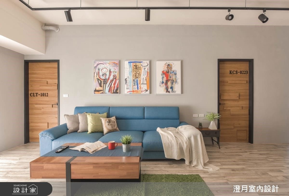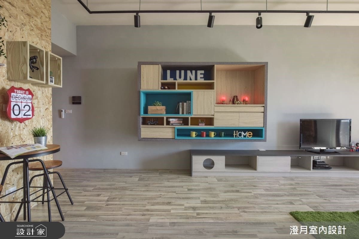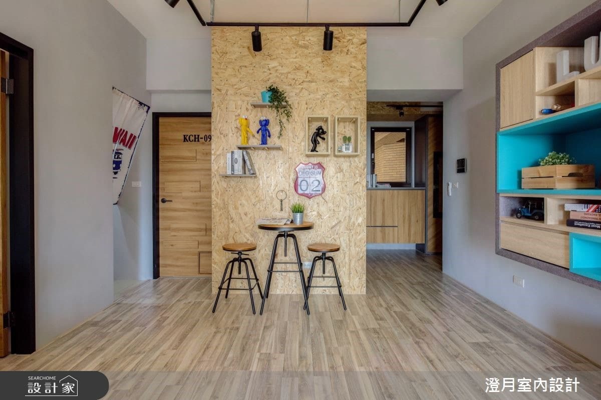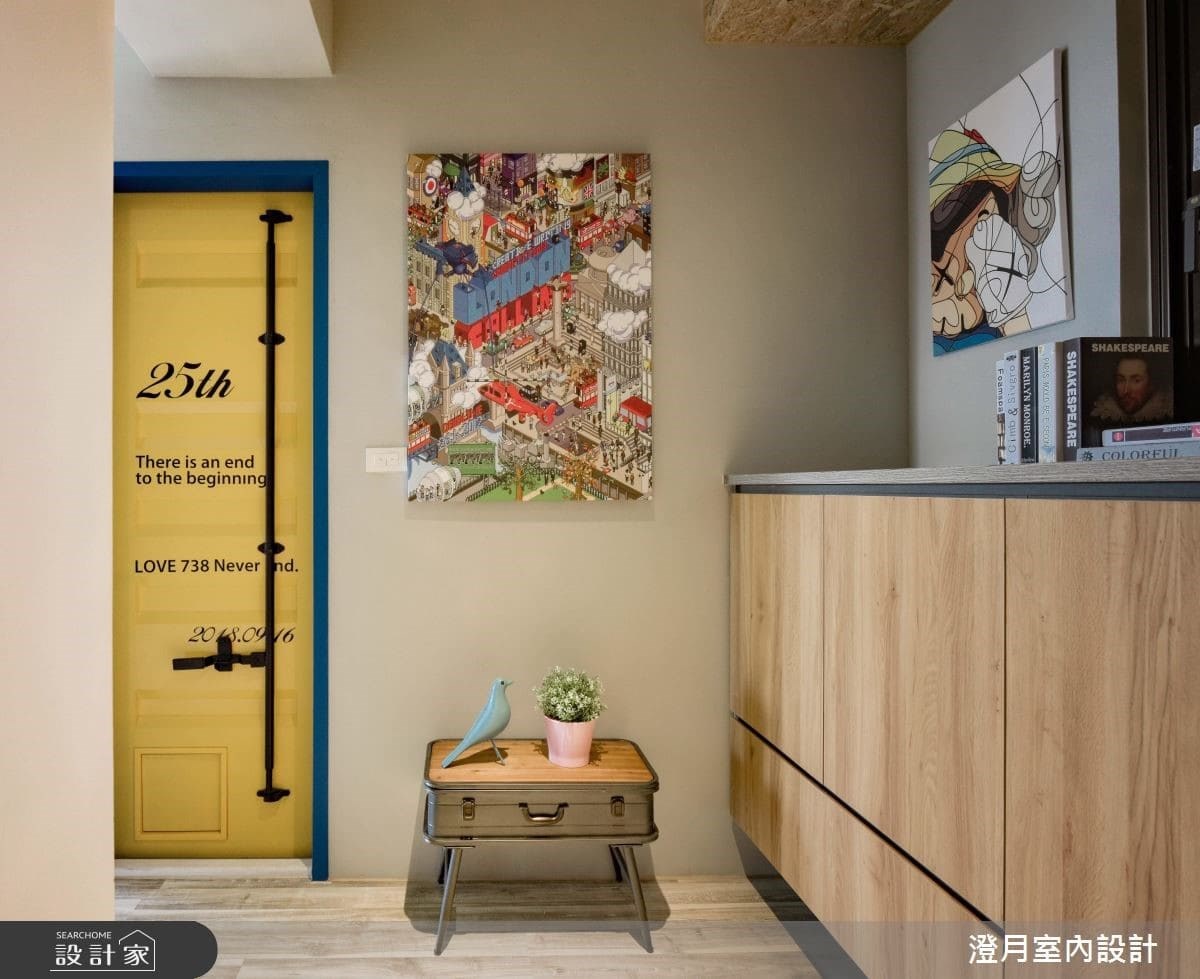延伸至玄關底端迎面而來是一幅屋主收藏的個性畫作,可強烈感受到女屋主對於設計的好品味。整體空間以工業風格為基底,融合長輩喜愛的貼心設計,像是神明桌無違和地融入跳色的收納櫃中,而為了毛小孩地面則使用好整理的超耐磨地板,並於多處層板打造貓跳台、設置貓屋,融合新潮與傳統,在美觀與實用中取得美好平衡。