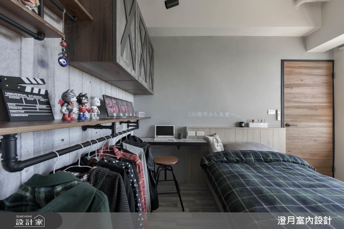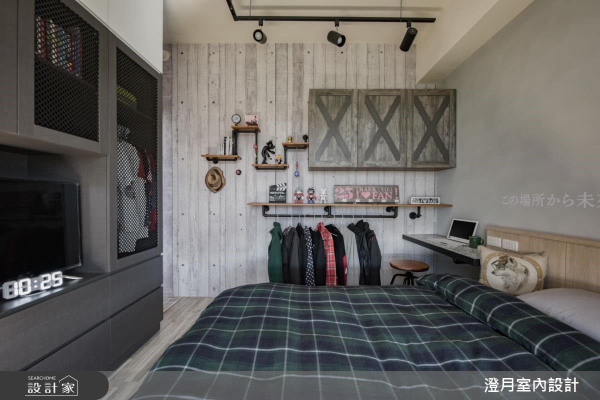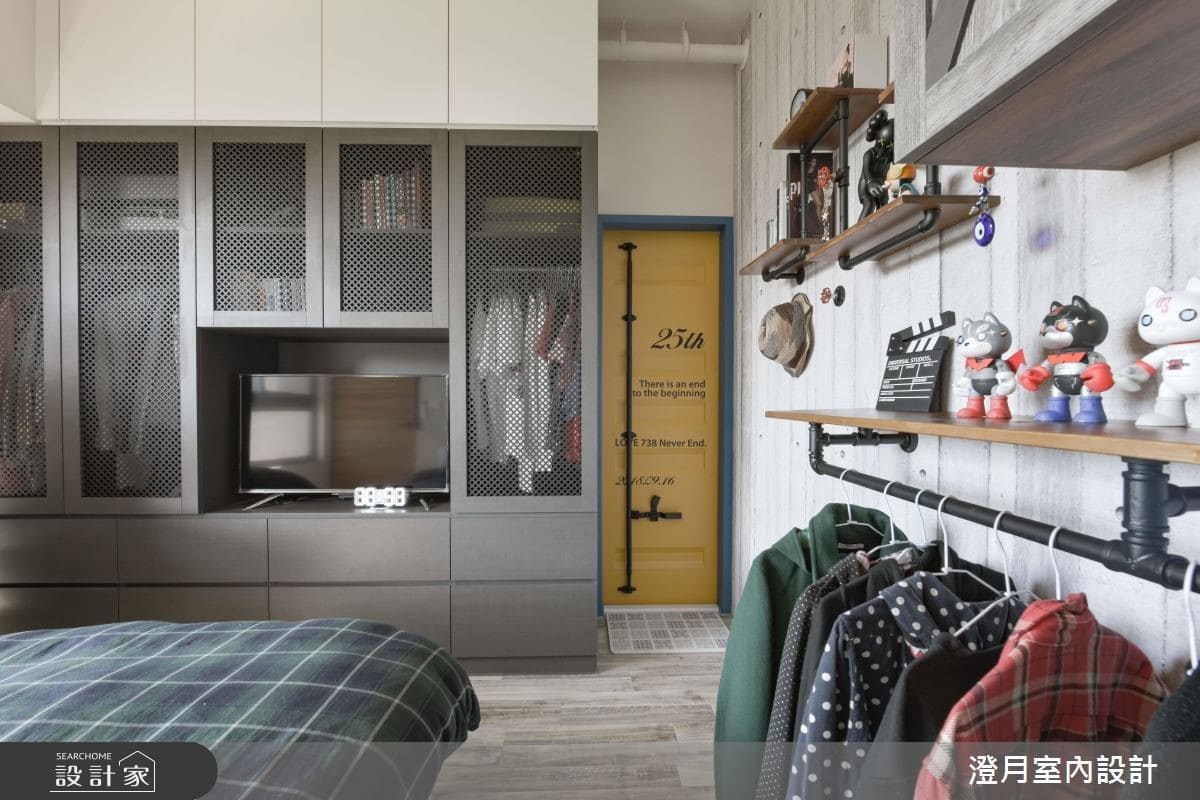無論是在客廳或是臥室中,皆可看見以洞洞板搭配層板的設計,是為了收納屋主眾多的公仔收藏而設計,而在臥室空間中,也沿用公領域使用的網狀鋁板作為黑色衣櫃,搭配鐵架及穀倉門櫃體,創造空間的粗獷性格,又能滿足收納需求。