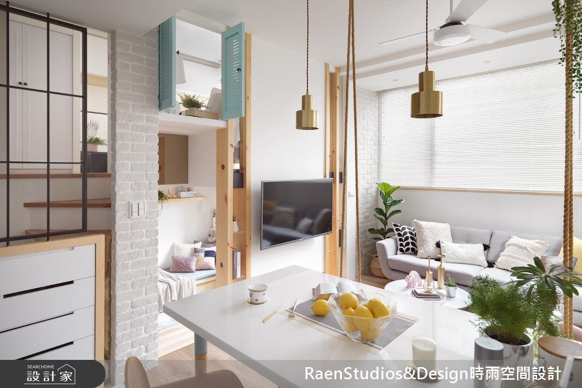 清爽的白色與淺米作為小宅色彩計畫,透過文化石、木百葉與馬來漆等不同質地與紋理的材料在同調中勾勒出北歐風迷人的細節;在白系與淺木組成的空間裡,將中性的清爽天藍點綴於餐桌桌腳與主臥小巧的木板葉窗,詮釋藝人五熊豐富而單純的生活姿態。