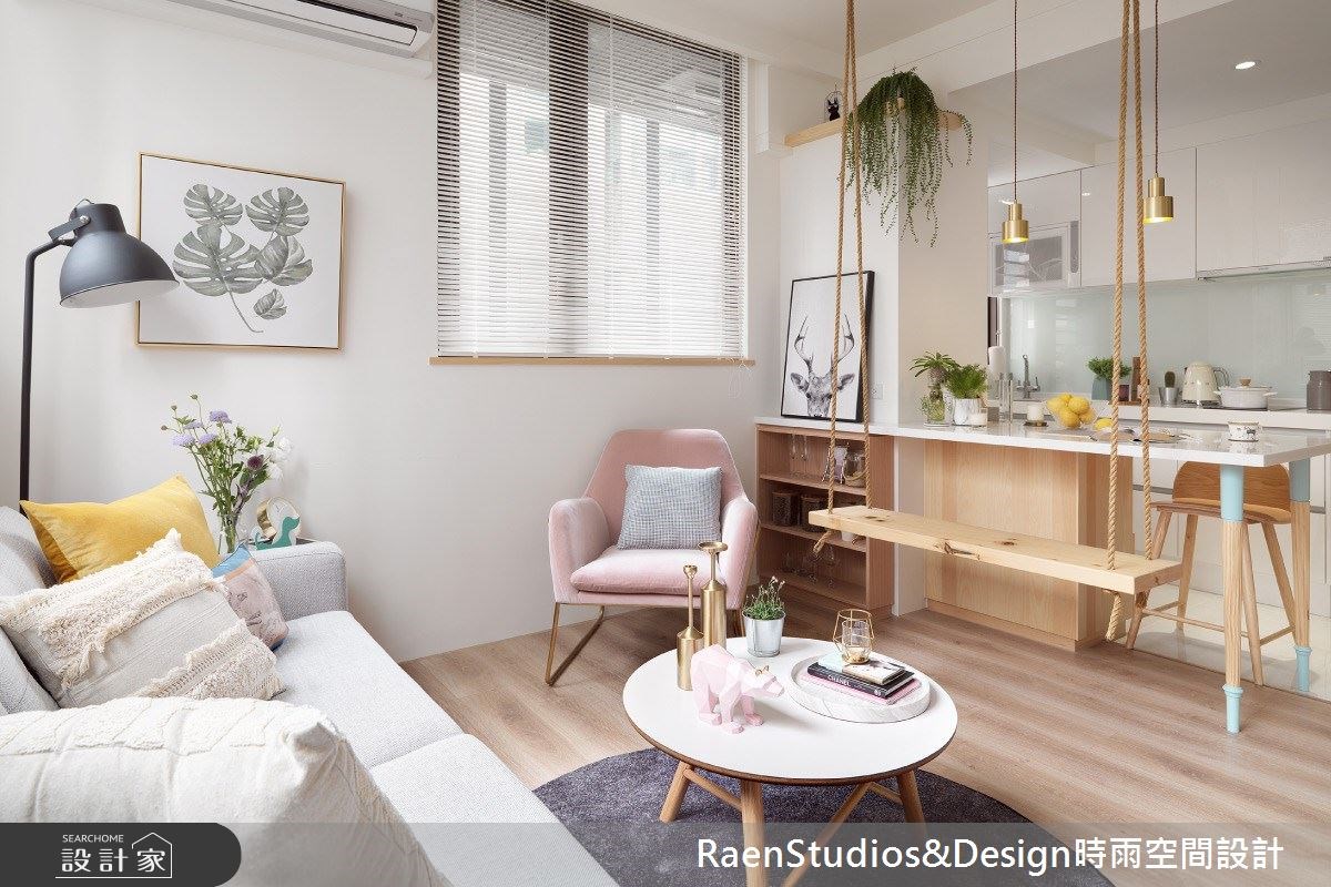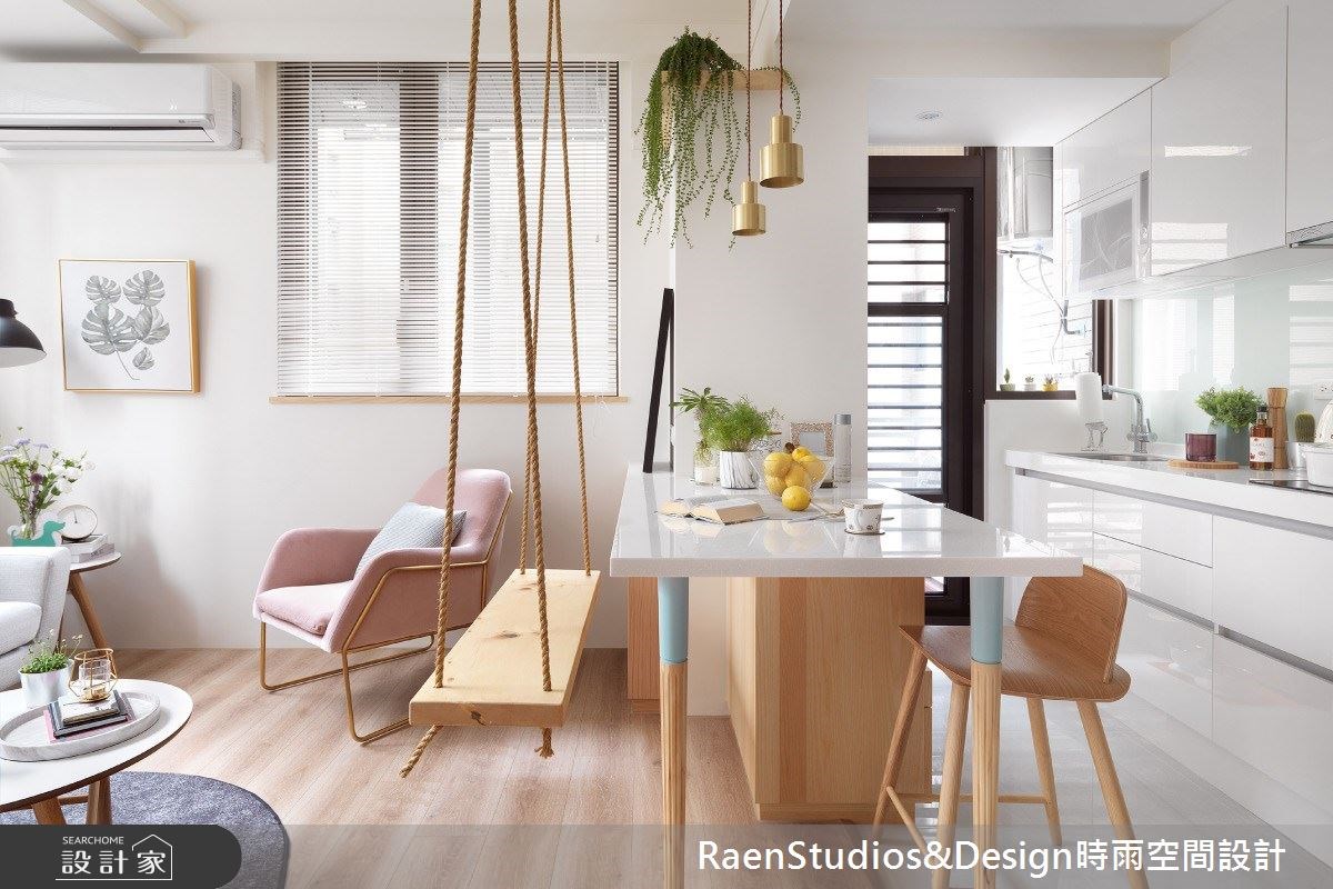 設計團隊根據藝人五熊對收納、烹飪與待客等特殊需求作為主要裝潢核心。洞悉新成屋優劣後,首先將凌亂動線收整為一條主幹道,餐廚與客廳以開放式設計安排於廊道兩側,水平與垂直重整空間優化生活動線。開放式廚房與廳區中央增設廚房中島,下方雙面櫃體擴充了收納亦延展料理檯面;登山釘懸吊的盪鞦韆取代吧台椅凳,童趣設計為空間調味,也讓愛犬可以恣意穿梭在腳邊、打掃起來也更方便。小宅最重要的收納透過與牆面整合與雙面設計發揮最大坪效,強化客廳與餐廚的鏈結,能適應多人聚會、也能獨自享受。