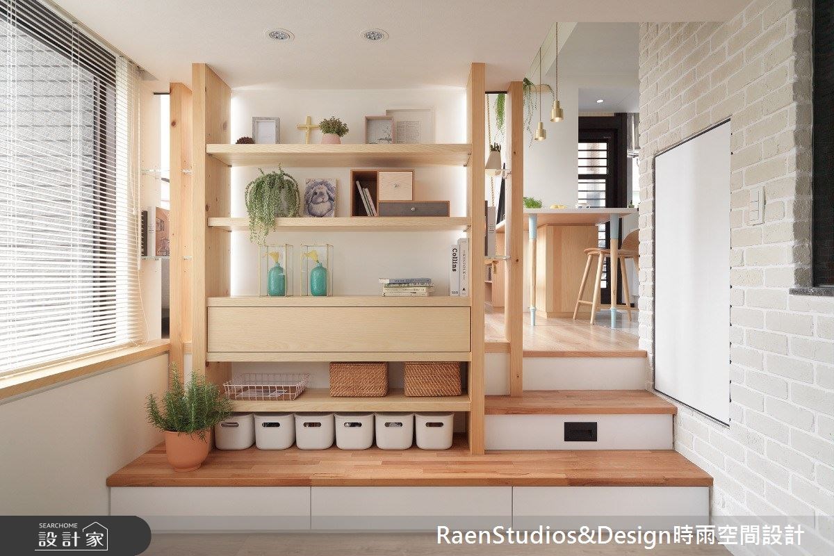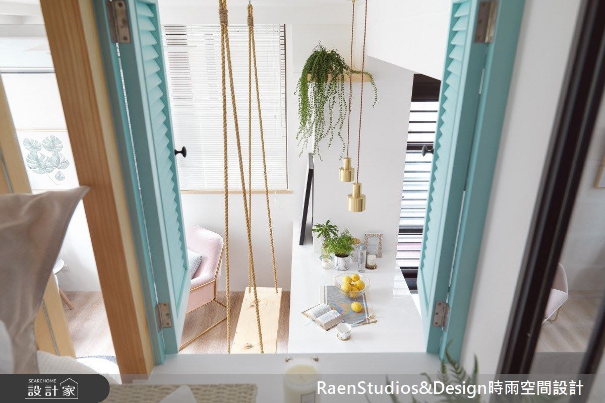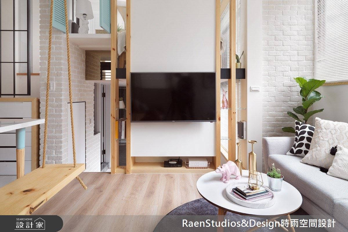 利用小宅挑高四米的優勢做分層處理,客廳電視牆兩側採穿透設計,順著階梯往下、電視牆背面成了收納書牆,稍微下沈的空間形塑靜謐舒適的陽光臥榻。重塑裏側衛浴後,泡澡時可飽覽挑高落地窗外的綠意與陽光;洗手台改造成時髦的化妝間,對於需要保養與上妝的女藝人來說更佳實用。通往夾層主臥的階梯重塑後不僅將原本突出的樑柱隱藏於設計,精緻的法式玻璃鐵窗花結合收納櫃體,將機能與美型整合於一道玄關屏風裡,在北歐設計中注入浪漫的法式風情。