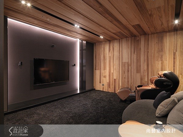 原本給人封閉、壓迫的視聽空間,在設計師的設計配置下,運用木元素打造其空間,於天花板、牆面以ㄇ字框架整體空間,再搭配厚實地毯,去除原本的冰冷感,多了一份溫暖與人文感受。