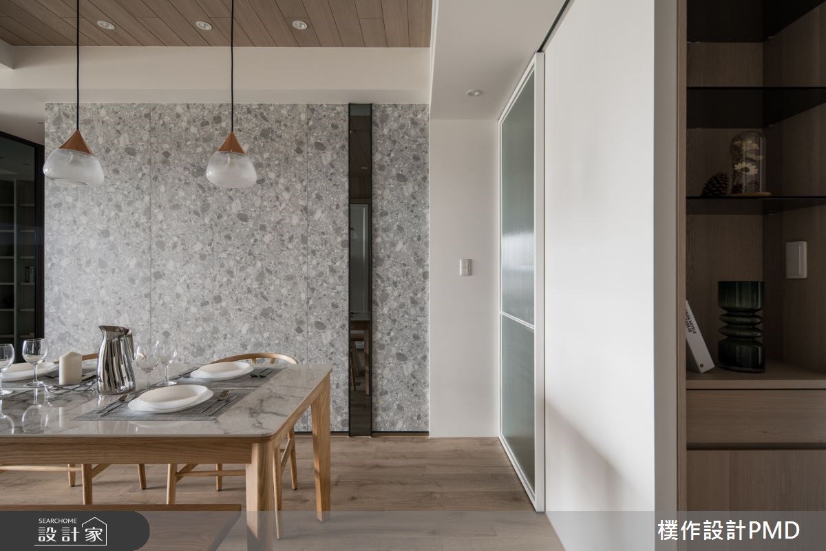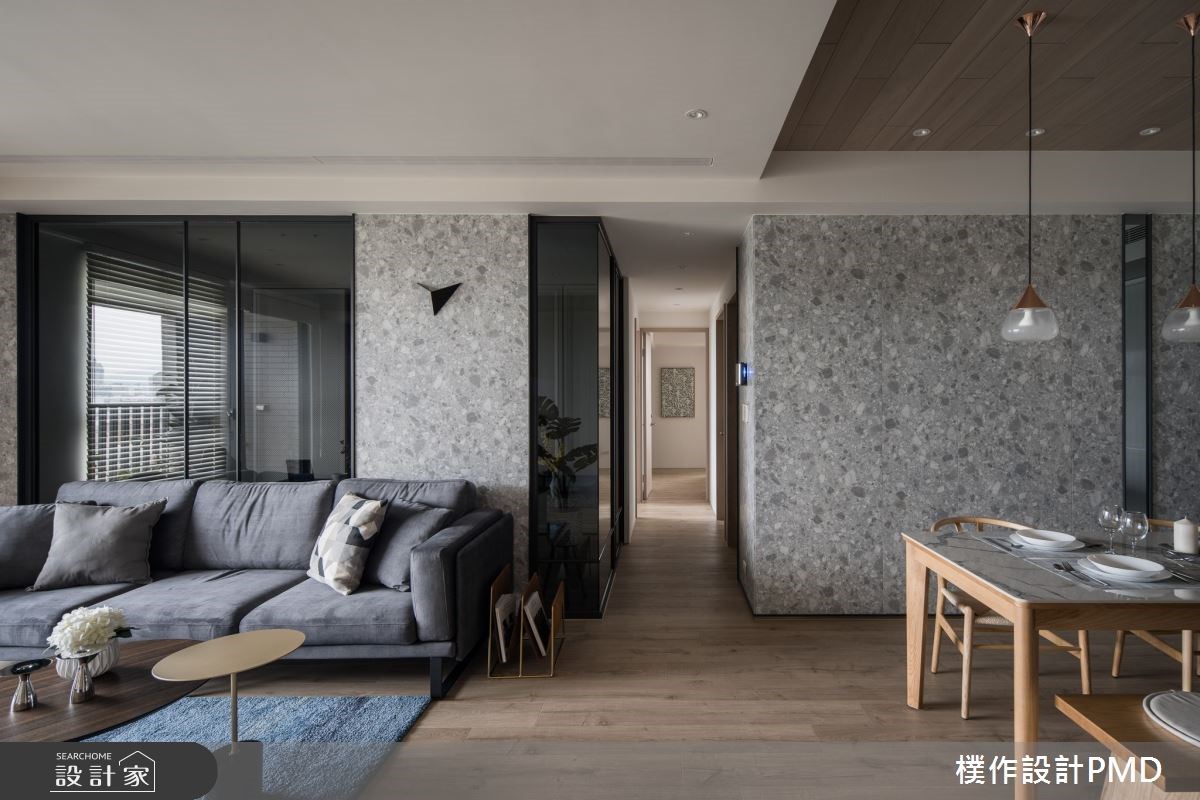 玄關運用大樑位置規劃公共空間的主牆,從鞋櫃、展示櫃、影音櫃到電視牆,設計師透過俐落的手法,將空間難題轉變成居家亮點;線板、木格柵與深色石材的異材質組合,更是延展出宛若百坪豪宅的豐富表情。而客廳沙發背牆和餐廳主牆皆採取灰色仿石紋理飾板,細膩放大空間感,展現內外景緻交融的深邃美學。