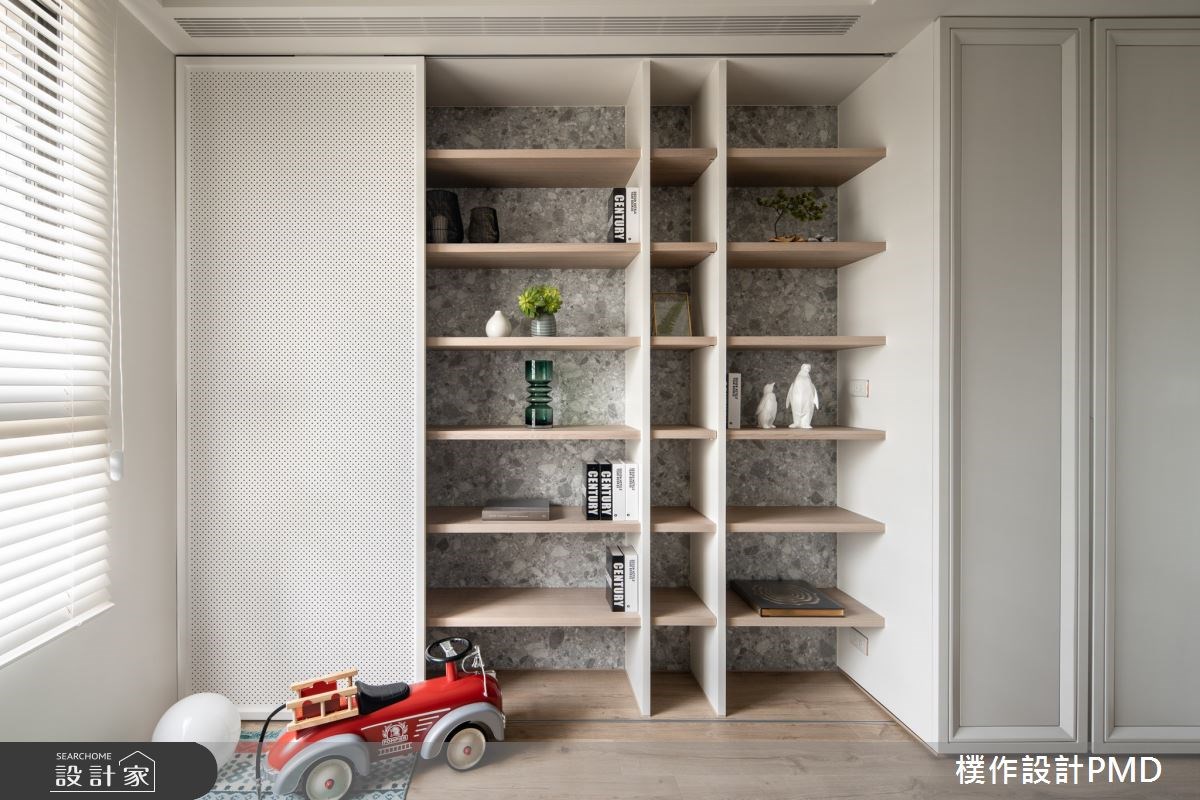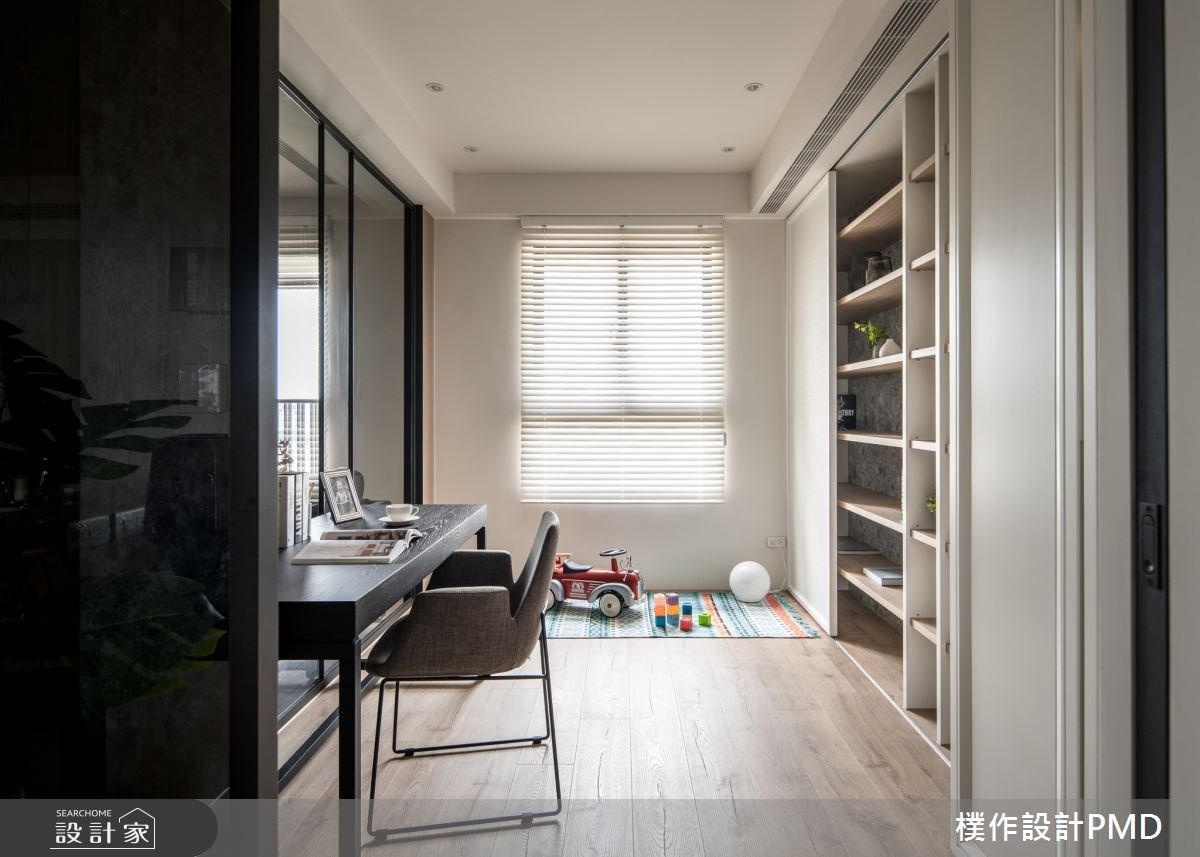 書房使用通透的玻璃和鐵件,創造多功能格局的輕隔間,巧妙地讓光線、視線可以依循動線,逐漸自公共空間移轉至私領域。書房的收納牆面選擇白色沖孔板,作為開放式書櫃造型,在門片的輕輕推拉中,表現空間端景的多變面貌。除此之外,窗邊也刻意預留彈性空間,讓孩子能夠在此開心玩耍,促進親子間的好感情。