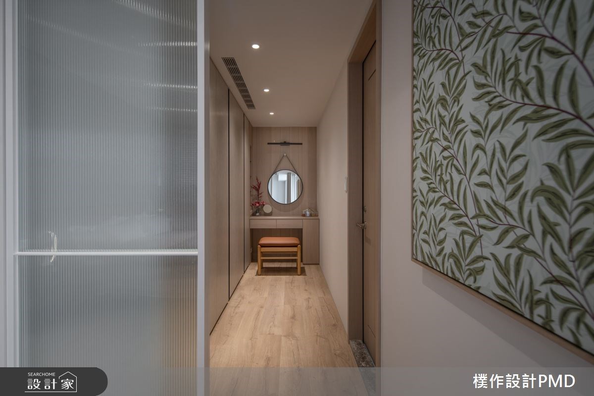 主臥室藉由木格柵、皮革繃布及鍍鈦線條,營造沉穩優雅的床頭牆質感,而床尾的小陽台則可以讓夫妻倆在下班後,欣賞一望無際的美麗夜景。更衣室則是透過移動次臥隔間牆,以及納入通向主臥衛浴的走道空間,劃分出擁有化妝台、衣櫃的機能場域,還可以拉上玻璃拉門,享受自在放鬆的私人時光。