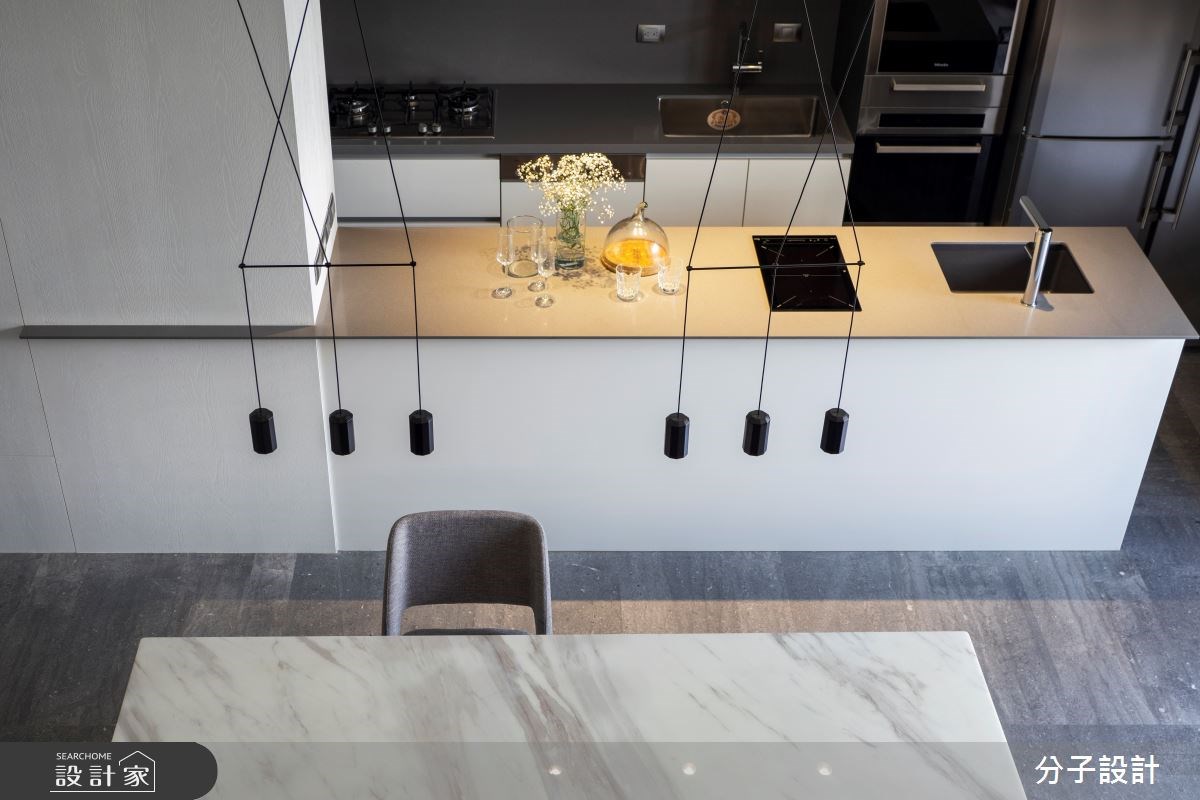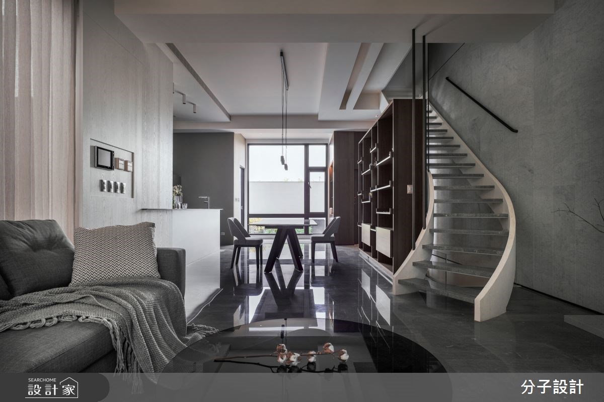 分子設計團隊針對 56 坪透天別墅的公領域規劃,透過開放格局及格柵應用,讓自然光線得以順暢流入室內中,並選用多種具反射特色的材料加乘光影層次,白天不開燈有完美採光,夜晚在輔助光照的點綴中也舒適放鬆。