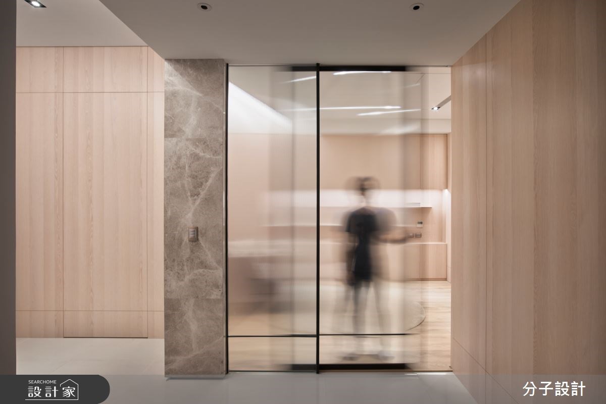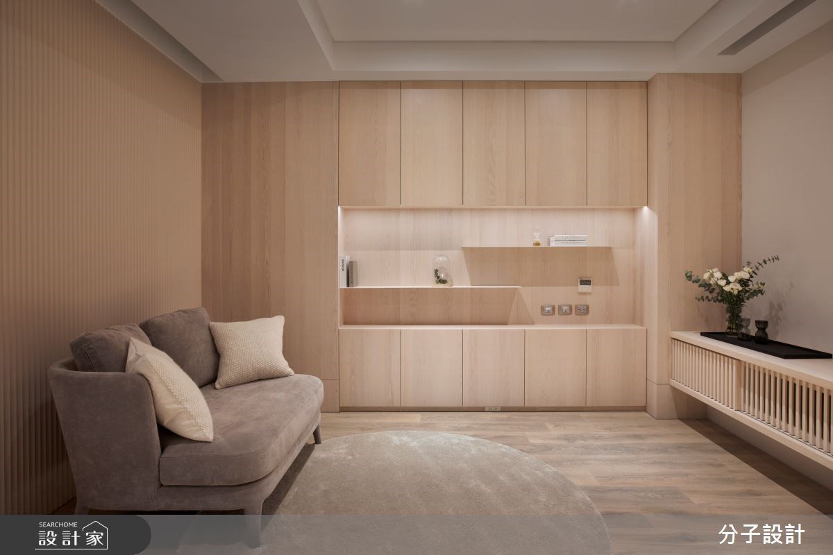對於採光不足的地下室視聽空間,分子團隊先利用穿透的鐵件玻璃拉門引光入內,櫃體及天花板的間接照明補足光線,徹底擺脫地下室的陰暗視野,讓娛樂放鬆空間也有了柔和的氣氛。