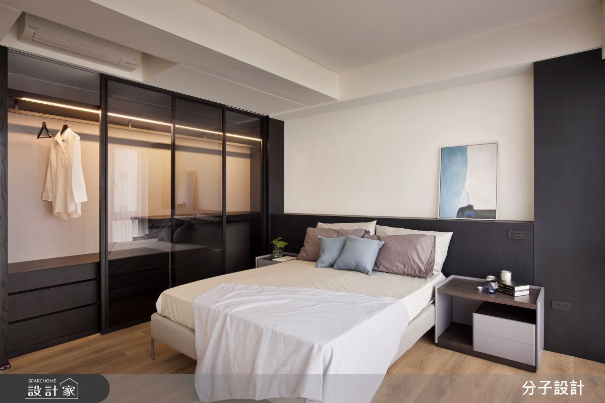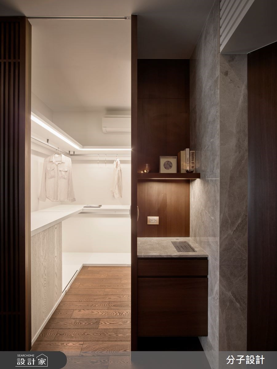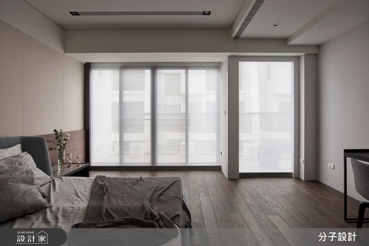 一樓偏長型的格局中,屏除隔間牆,以光影動線為主軸,依序安排開放式廚房、餐廳及客廳,打造寬敞的空間感;壁面垂直的線條設計,抬生了室內屋高帶來挑高視覺感受;餐廳區的茶器展示收納櫃,背面選擇細格柵設計,透露寧靜禪風氣息,不僅讓光影流竄於各角落,搭配35度弧線往上延伸的鏤空樓梯,成為開放空間的亮點,帶來透亮又靜謐的居家印象。寢臥內選用木地板,營造溫暖休閒氣氛,雙腳踩踏觸感舒適,且不論床頭閱讀燈、衣櫃輔助照明等燈光計畫,皆予以適合的光影滿足需求。