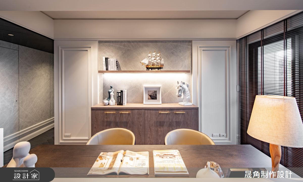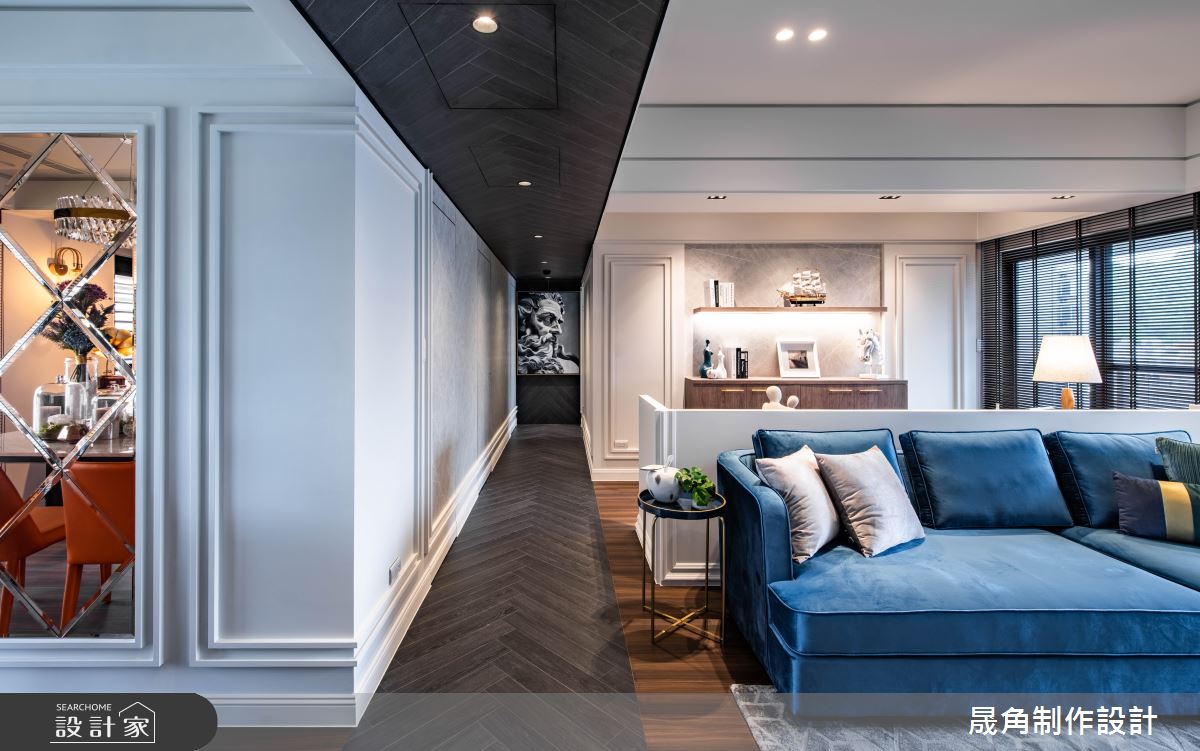 空間以窗面引導美好自然光條件,營造室內明亮感,除了運用沈穩內斂的諾雅斯灰大理石及意大利石紋磚,也刻意讓電視牆的寶石綠蛇紋石平台做出 L 型轉折、串聯窗邊領域,形成動線的指引,而簡約的雙線線板點綴,則刻畫出了低調華麗的輕古典格調;針對走廊上無可必免的大樑。採用高對比手法,刻意採用礦物黑的人字紋木地板鋪設走廊天花與地板,弱化其存在感,而盡頭處更放上一幅無色彩的肖像畫,展現焦點與氣勢,營造出彷似劇場感的視覺效果!