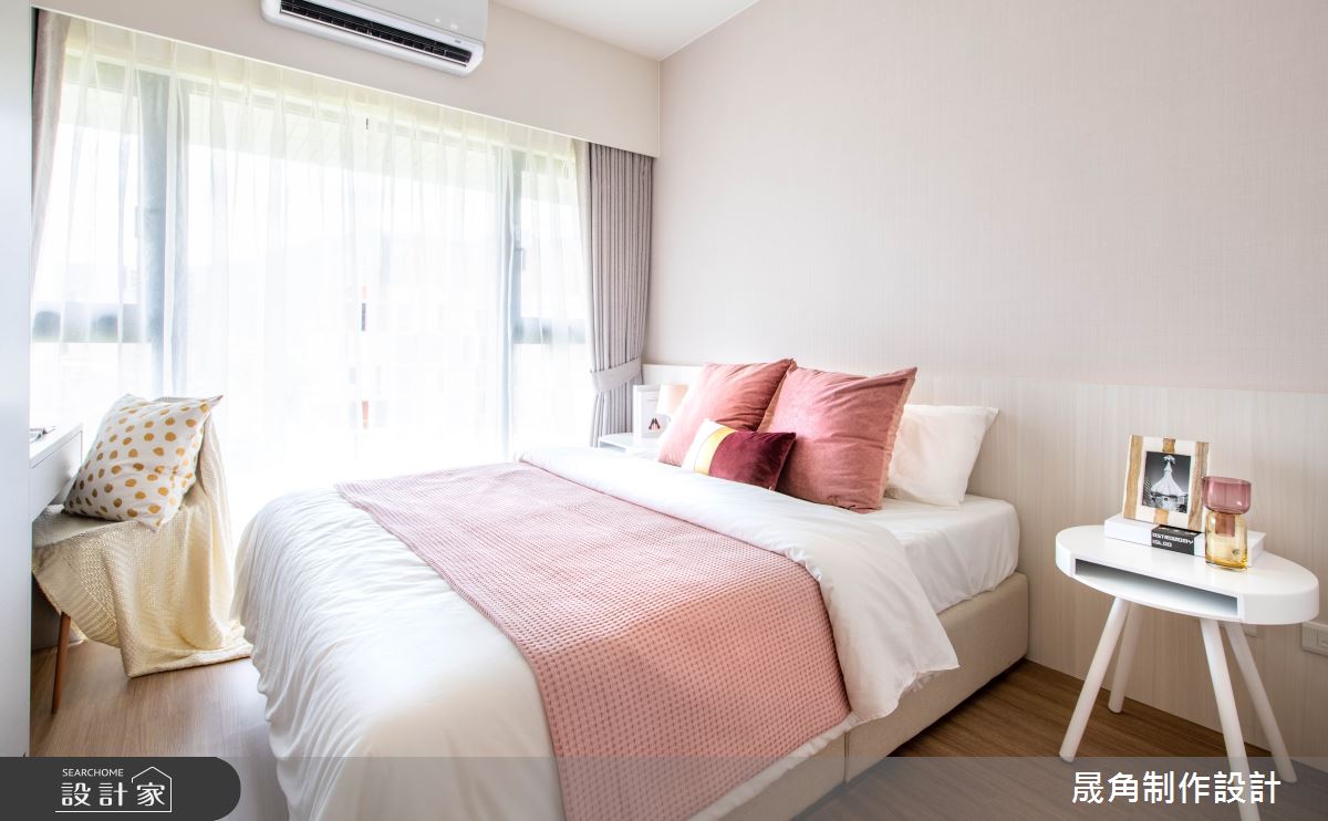 臥房予以糖果般的粉色鋪陳,採用明度高的粉嫩色系做鋪敘,讓色彩、燈飾與材質互相輝映,使愜意減壓的氣息貫穿全室!