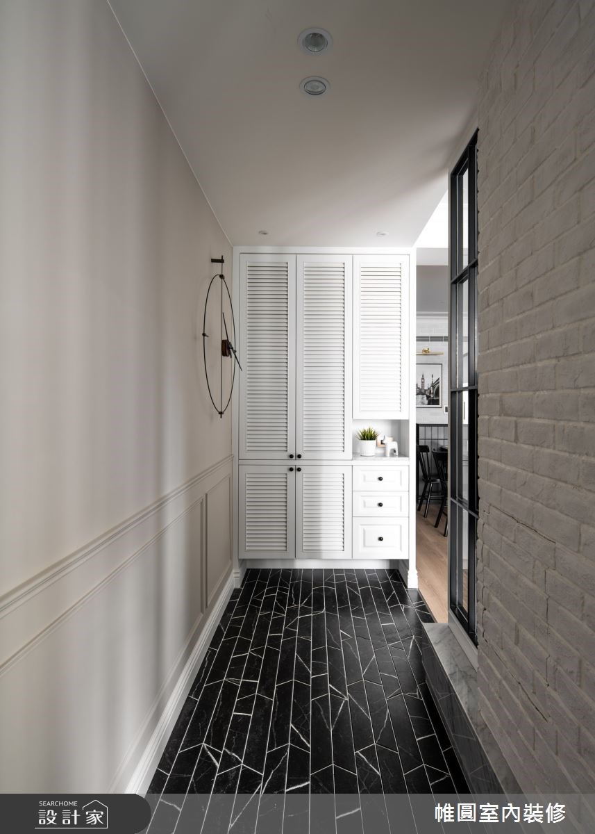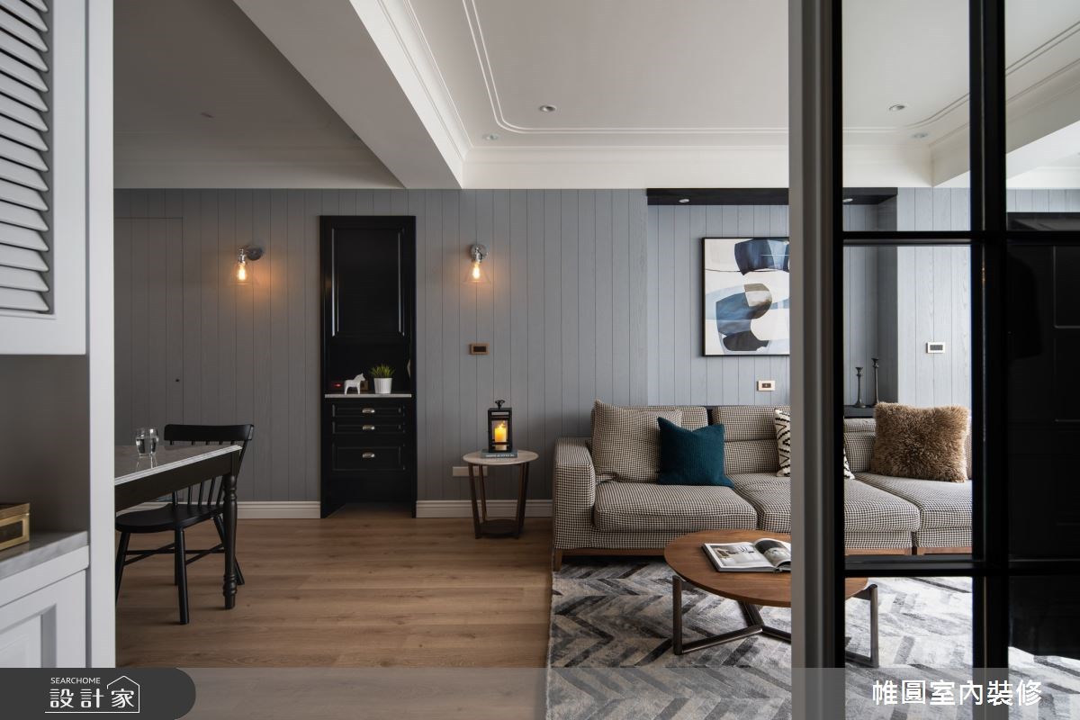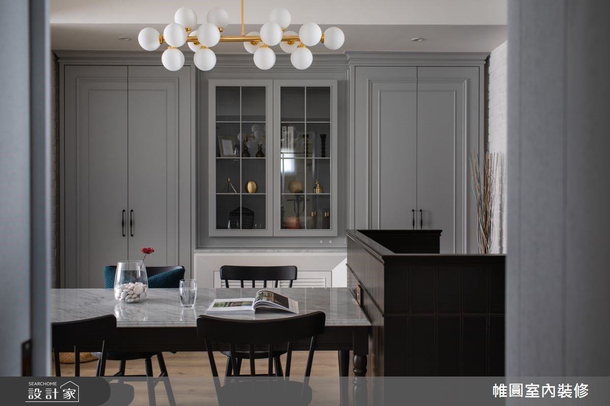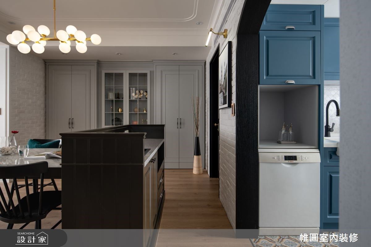 在整體空間中,大量使用美式風格中的代表性元素線板,無論是玄關櫃、電視櫃、廚具櫃等都可看見設計的巧思,襯托出居家的唯美質感,而連續性的裝飾線板,也能達到延伸空間的視覺效果。