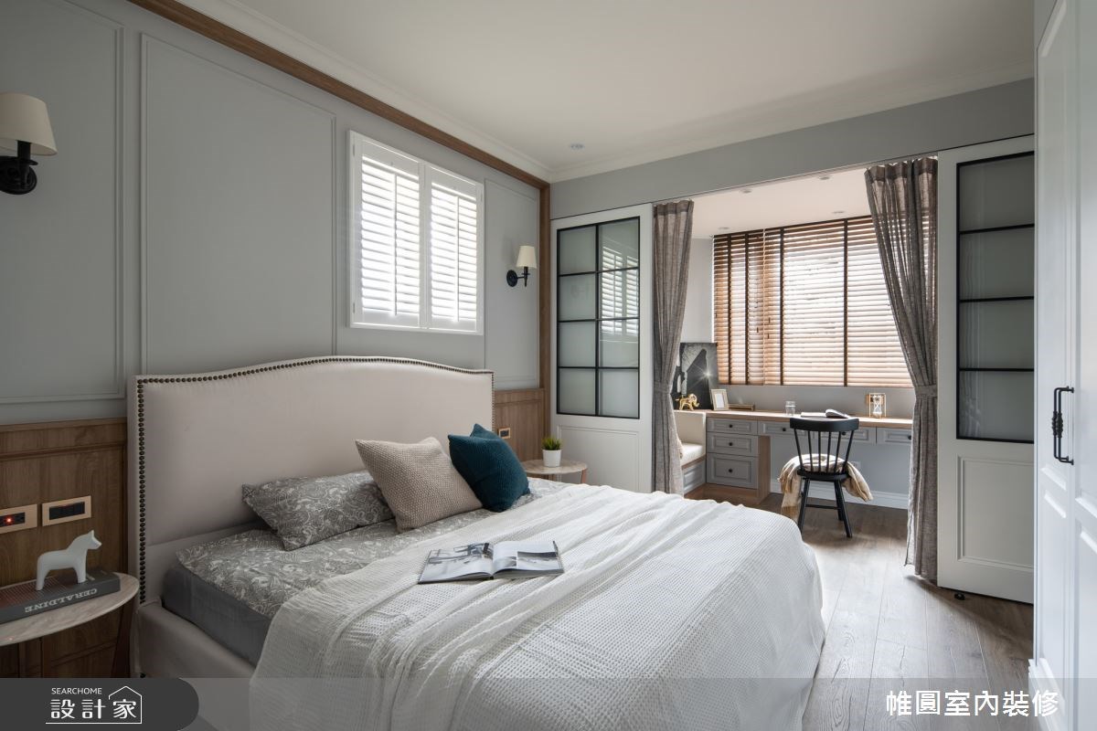 在主臥室中,則是在窗邊規劃一書房空間,配上格子窗門作為書房的入口,拉高空間的穿透度與光亮感,利用空間狹長的缺點,更優化了整體的空間,一間臥室更多實用功能。