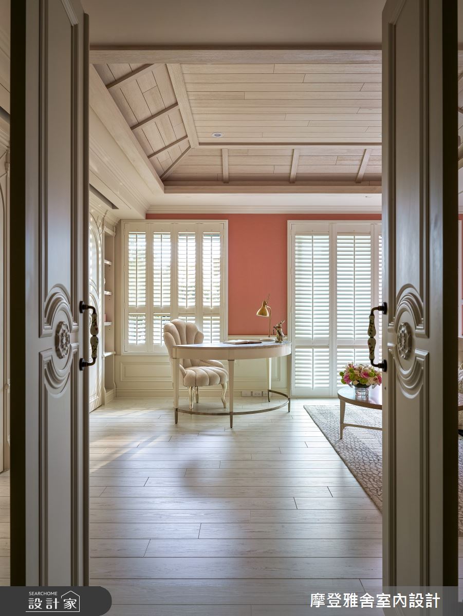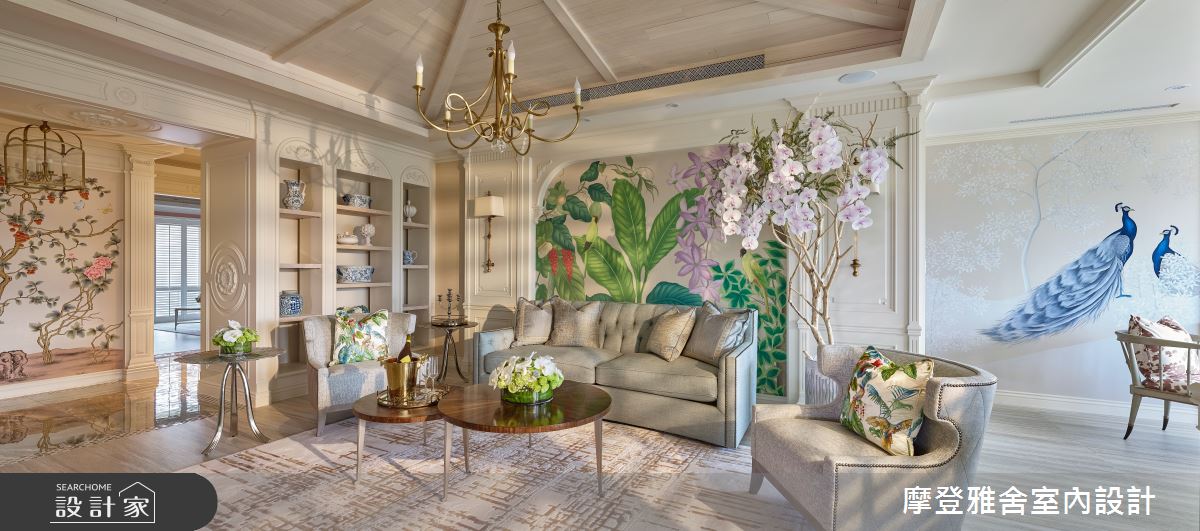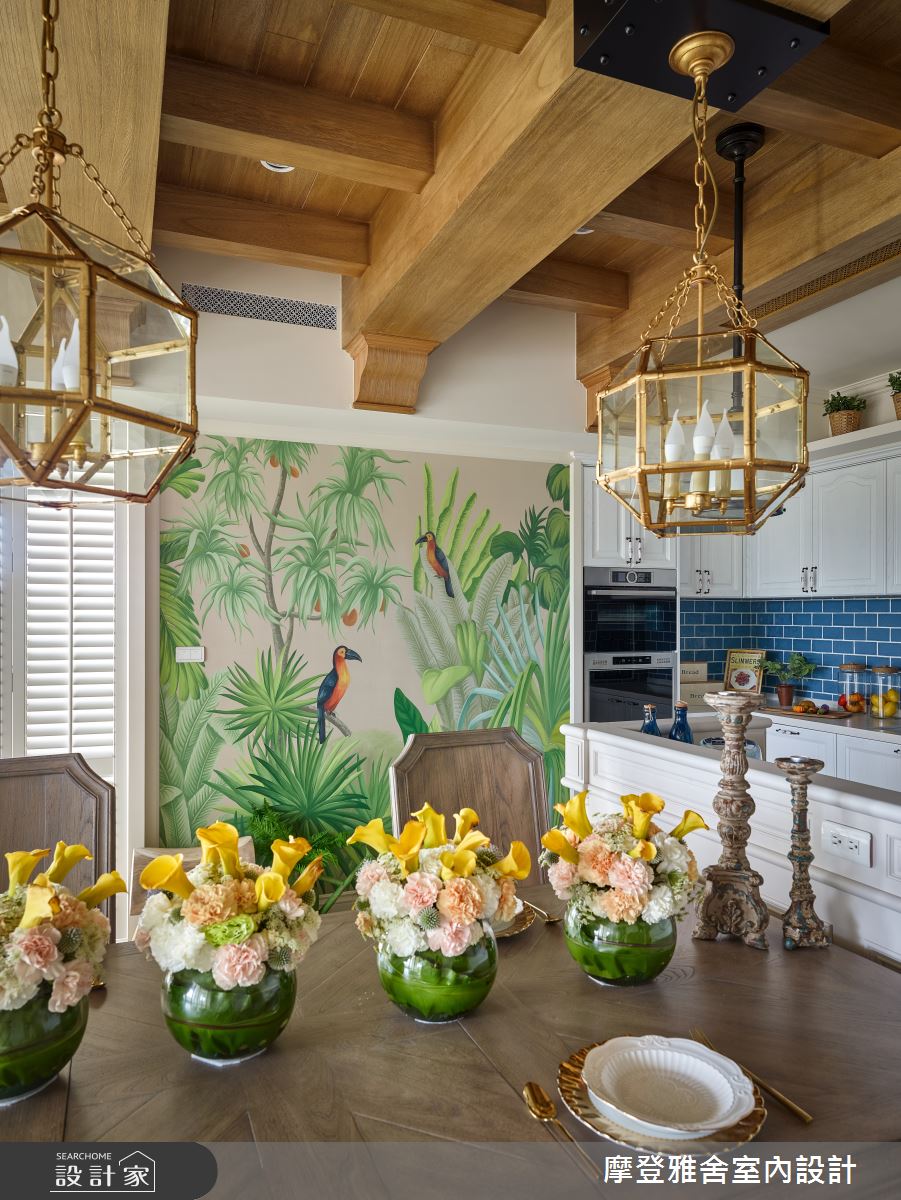 鄉村風天后王思文在屋主夫妻的夢想豪邸,以精心訂製的大圖壁紙,及稀有皮雕質材,讓大器雙玄關清楚訴說屋主夫妻的浪漫愛情故事。因著對手繪雕花的堅持,讓王思文設計師更注重豪宅高級訂製的藝術性表現,就連鳥語花香的訂製壁布,也以手工描繪出獨一無二的生活故事。