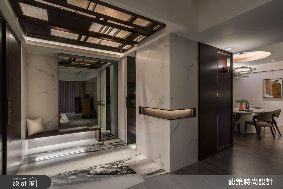 在格局上,湯鎮安設計師考量親友來訪需求,特別為屋主擴大玄關空間比例,並拓寬櫃體深度,增加儲物空間。依據屋主退休後的行動需求,設計師重整原屋的不規則動線,貼心規劃無障礙空間,且於玄關轉角處設置扶手,並搭配燈帶導引,讓居者於夜晚也能看清動線。為了修飾中島天花的大樑,設計師運用弧線造型,降低樑位過低的壓迫感,並於兩側加上間接燈光,營造空間層次感。除了在動線及空間費盡心思外,設計師也配置安全機能於臥房,藉由地坪鋪設編織地毯,不僅賦予止滑效果,地毯的圖騰也為空間提升精緻感,並訂製低檯度床型,體貼屋主下床的便利性。