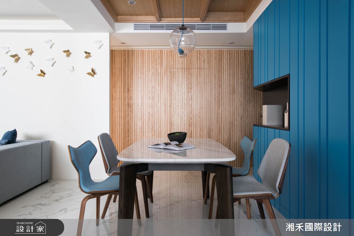 客廳、餐廳之間原有一道壓迫實牆,在打開牆面之後,不僅延展了空間視線,也將自然光導入室內,形成明亮開闊的感受;同時採用藍色作為主題色,電視牆以藍寶石大理石定調,搭配同色造型沙發,以及餐廳區的土耳其藍立面,展現鮮明的個性印象;並在客廳立面,裝飾優雅的陶藝品背景牆;主臥主色是藍色的馬來漆,呈現如石材並帶點粉光的細緻質感,女孩房則在床頭安排錯落有致的造型櫃體,兼具實用性與美觀!