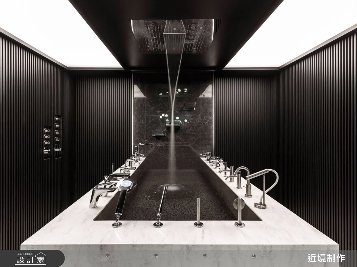 2F空間中的試水區,設計師規劃了一個長型黑色大理石水池,上面安置了24支蓮蓬頭,藉著不同的角度和鏡面反射,在空間中創造了另一種趣味性,也可以拉近了客人與產品之間的距離,更藉著燈光投射出不同層次的光暈!