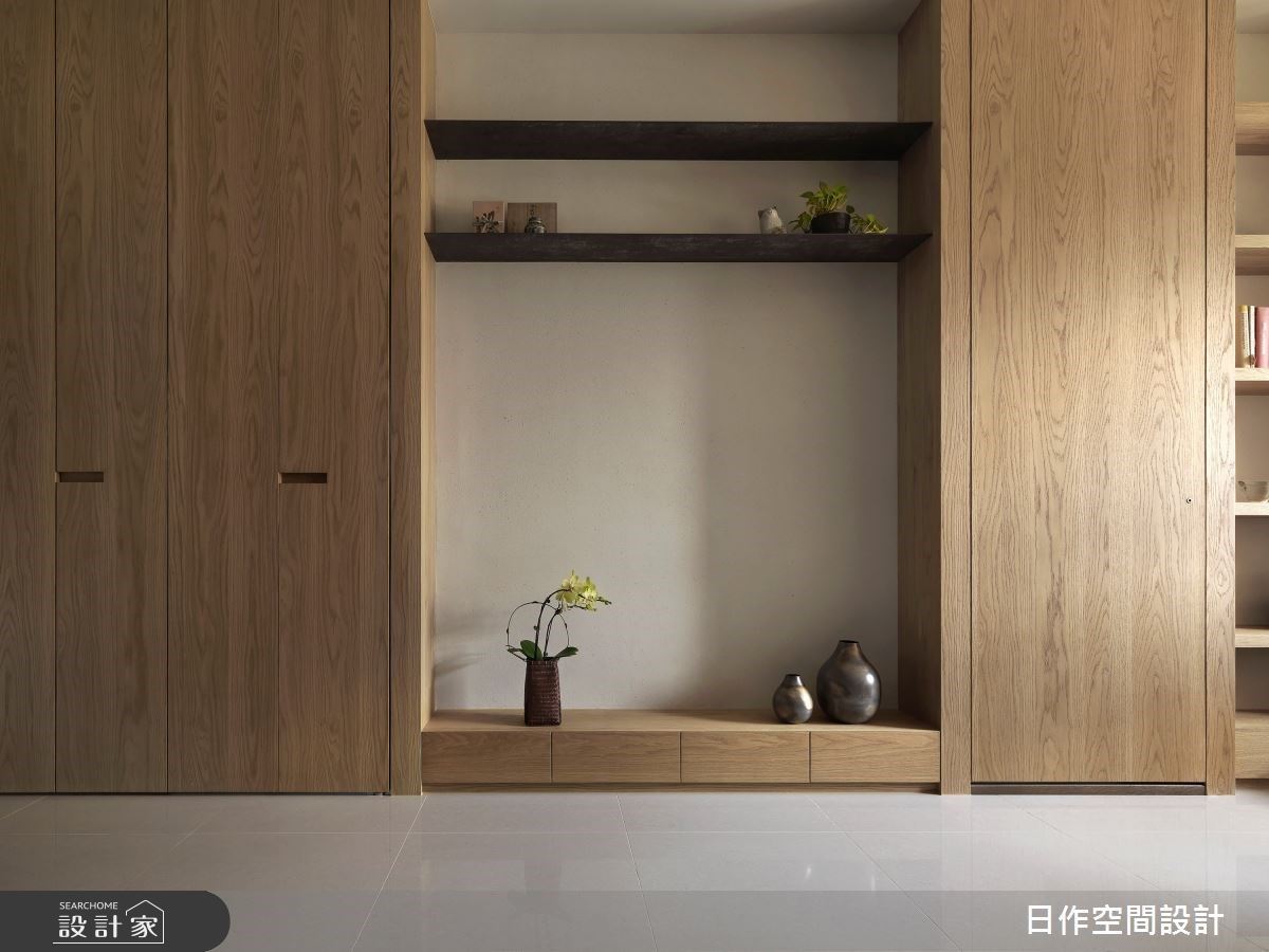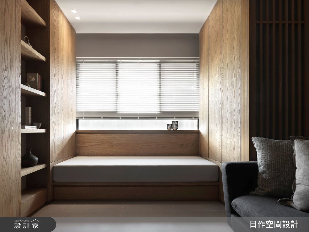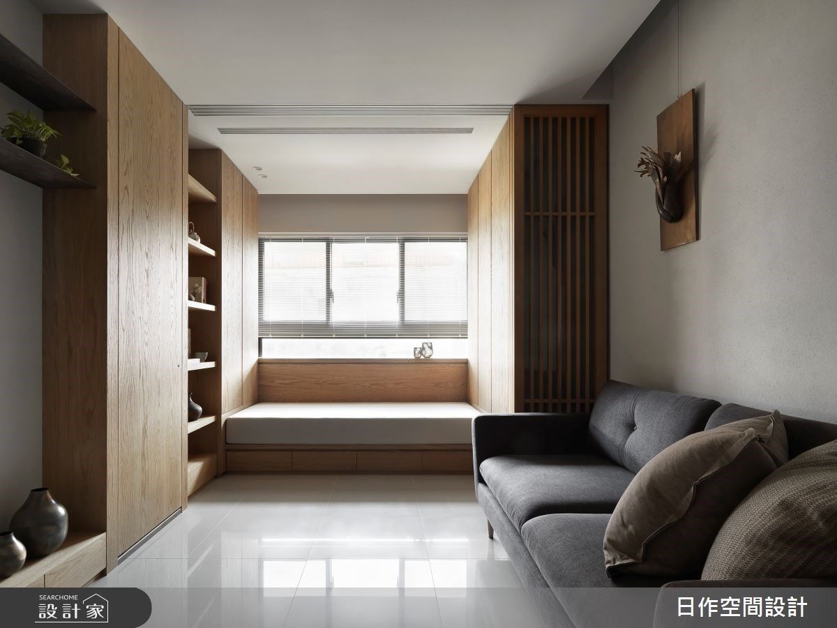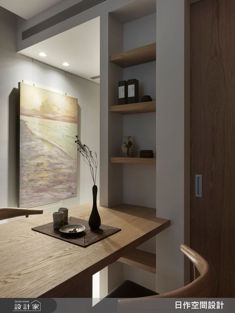 甫入玄關,一幅恬淡雅緻的印象畫揭開序幕,搭配展示燈光令人彷彿踏入藝廊。格局佈劃上,將客、餐廳合而為一,使外窗而來的光感瀰漫整室,並沿著窗邊配置木質臥榻,輔以兩側充沛的收納櫃體,滿足必須的生活機能,更創造日常的從容與愜意。客廳主牆,在綿延不斷的木質基底下,悄然留下一面空白,同時輕輕以陶器、花藝點綴,形塑優雅的日式風情。臥榻與客廳間,利用木格柵勾勒日式拉門,不但具有調節明暗的效果,也為兩人劃出獨立的私密空間。