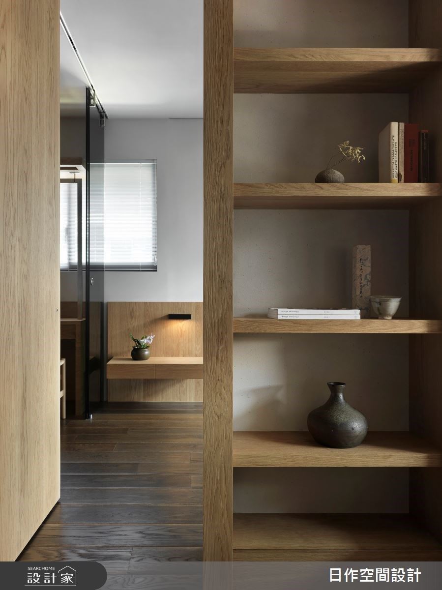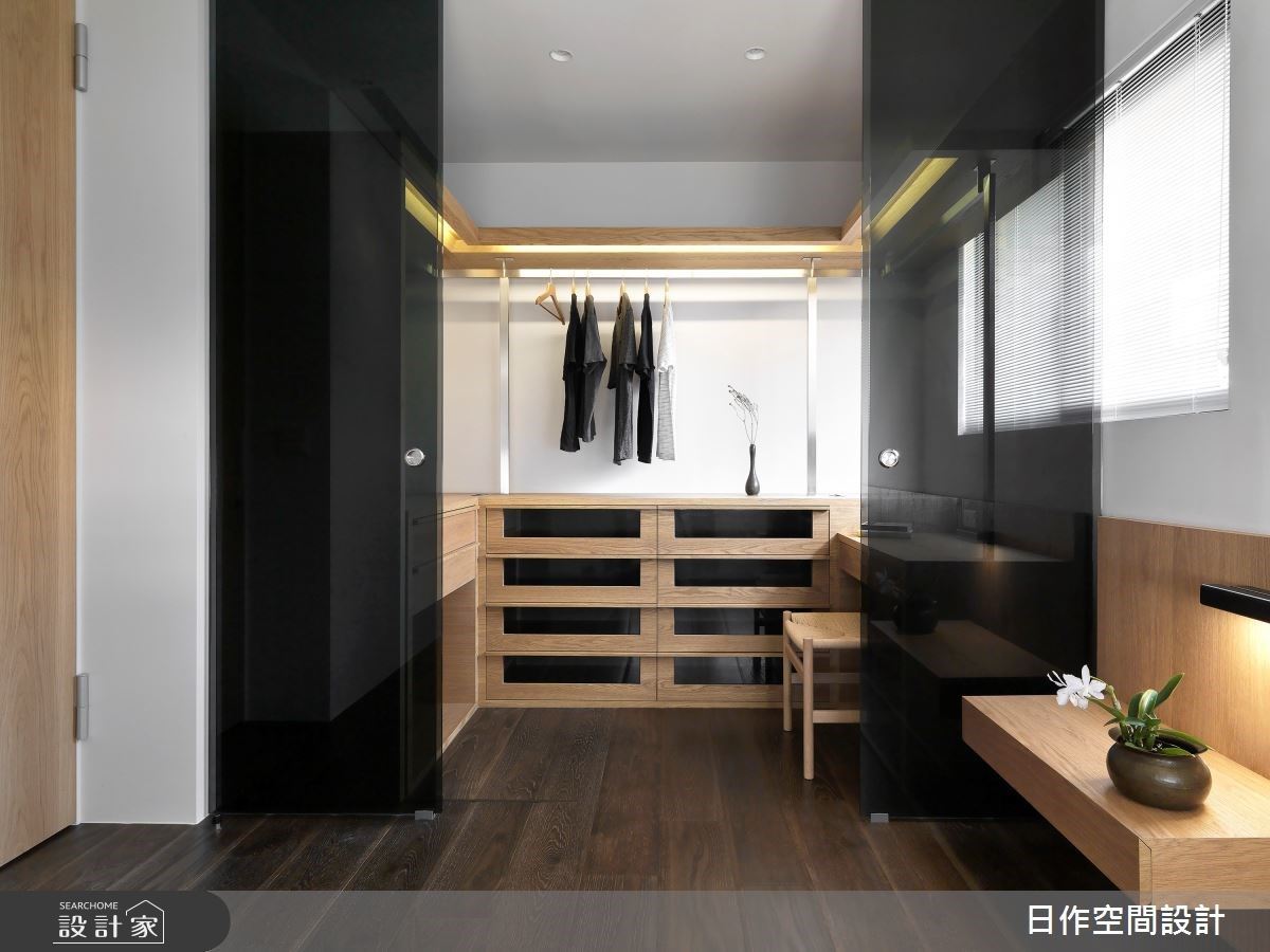 私領域內,藉由黑玻拉門刻畫更衣空間,使光線穿梭其中,並延用木質材打造櫃體與化妝檯面,使人享受於慵懶自在的妝點時光。