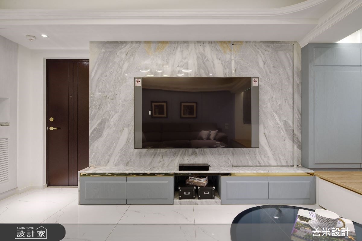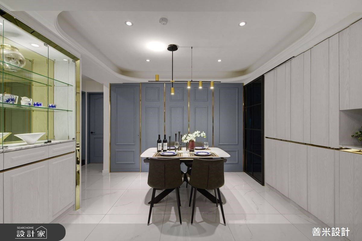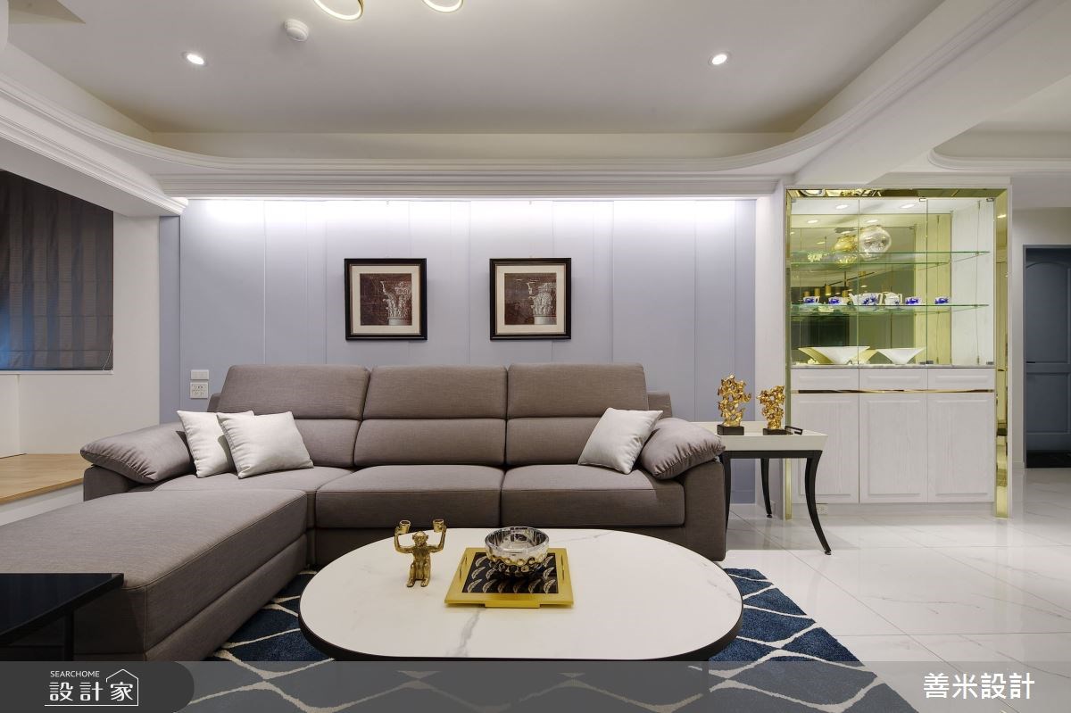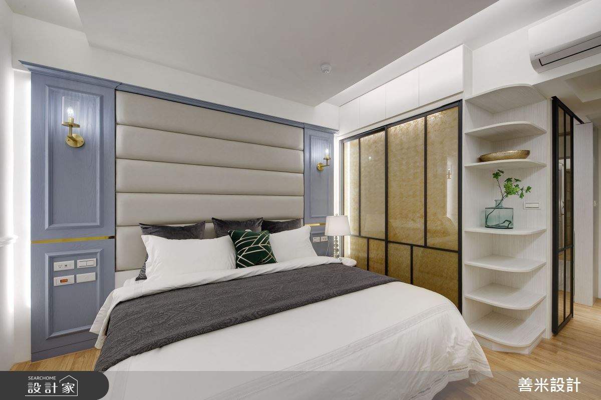 35 坪老宅有著漏水、突兀樑柱、格局不佳等屋況問題,善米設計首重於重整格局與改善漏水的基礎工程,全室拆除重新規劃後,善用隱藏設計將突兀視覺轉化為收納空間,重拾老屋裡的舒適並帶來實用機能,接著適度的鍍金飾條、優雅線板加注了幾許精緻質感,賦予截然不同的混搭風奢雅氣氛。