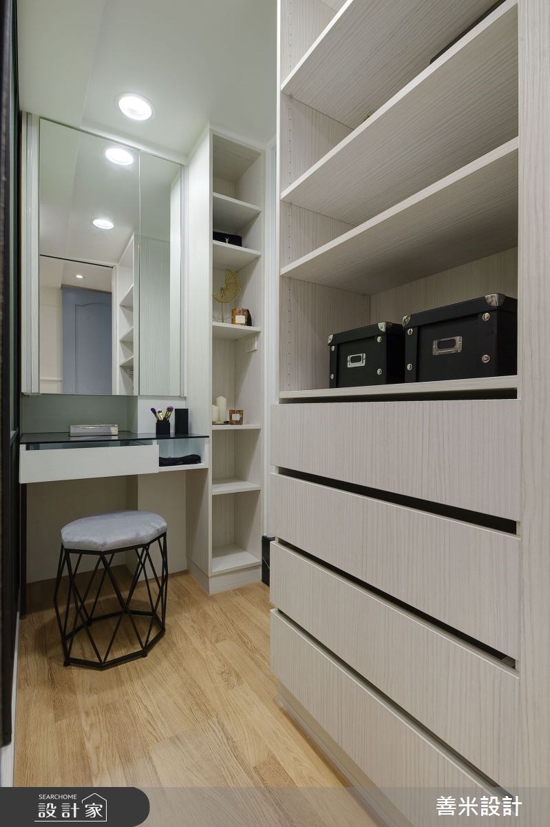 格局重塑後,兩間臥室皆著重於衣物收納的安排,各擁獨立梳妝更衣區,更分別在收納設計下功夫,無論是轉角修飾直角的弧形層架、間接光氛弱化櫃體重量的手法,展現設計師不放過每個細節的周全設計,房內的大型樑柱也透過流線的作法修飾,老屋翻新的重重難關一一破解。