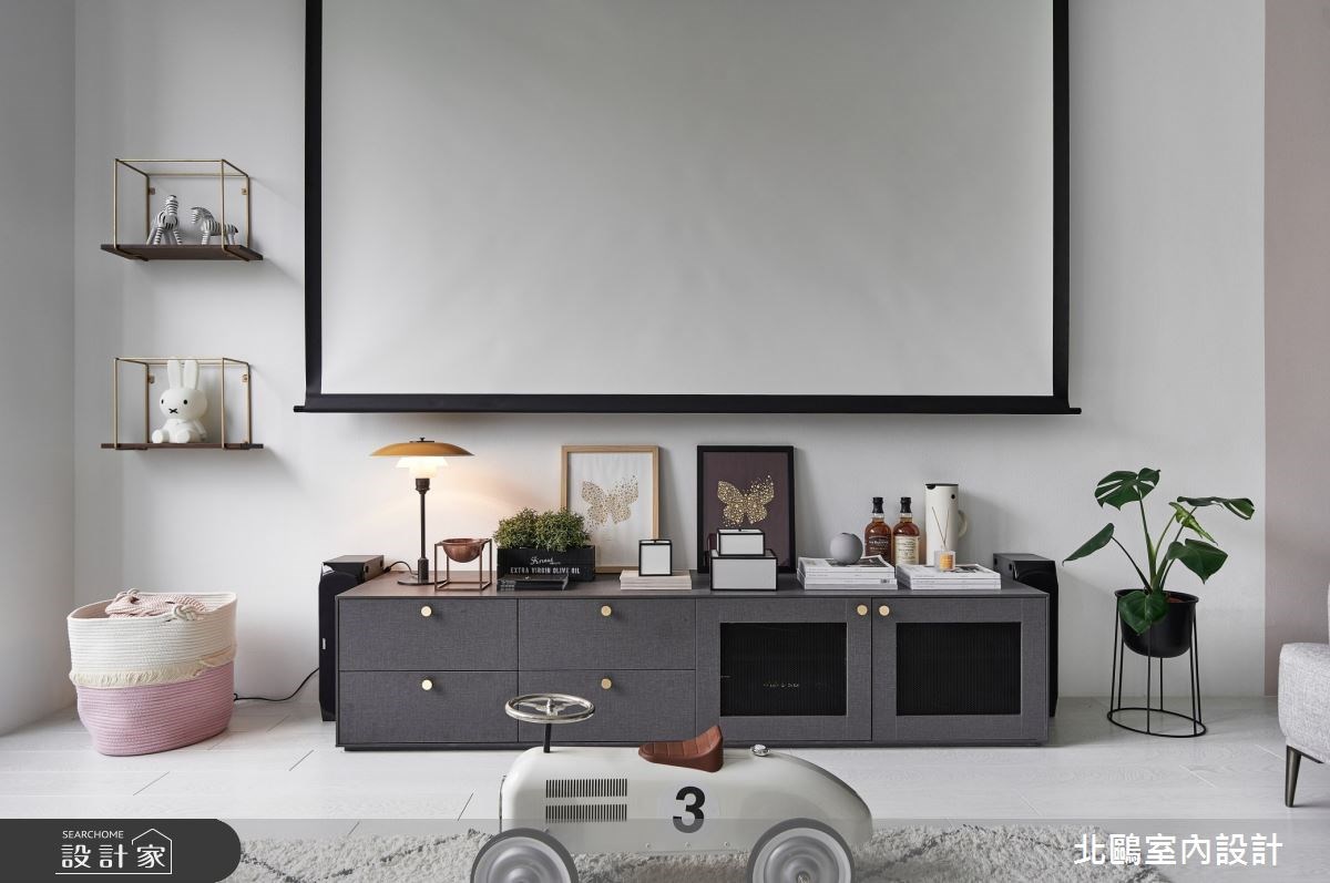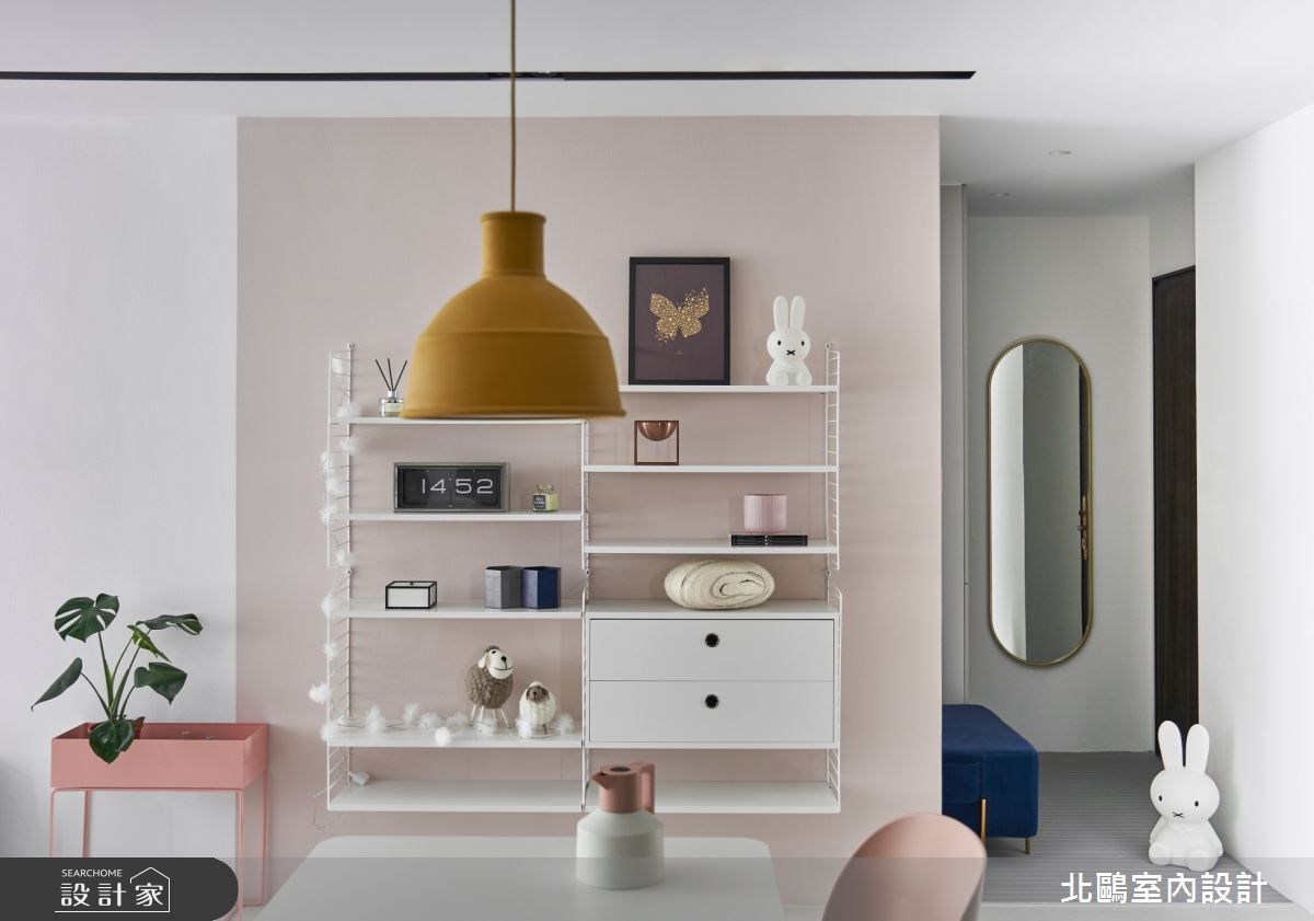 客廳捨棄制式的電視牆設計,改用機動性較高的投影布幕,結合下方透氣鐵網的電視櫃,平日可以保持牆面的乾淨,週末又可以沉浸於電影的浪漫世界中。餐廳主牆採取莫蘭迪粉為底色,白色的展示架與可愛燈串的配合,點亮空間一隅,而餐廳吊燈則是運用橘黃色的簡約款式,在深色電器櫃前跳脫出甜中帶酸的俏皮性格。