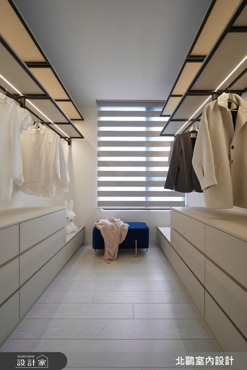 設計師為小夫妻量身打造上為開放式衣架、下為抽屜收納的明亮更衣室,在線性燈光的照射下,每件衣服彷彿述說著自己的故事,如此輕鬆無負擔。