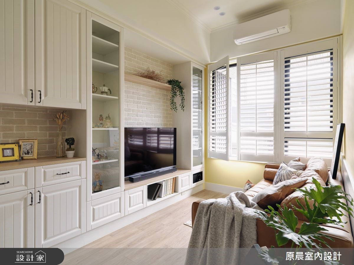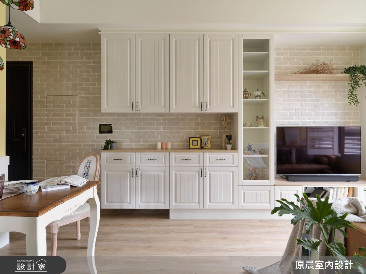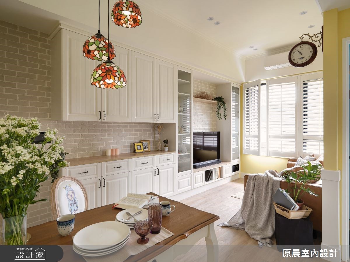 進門玄關壁面刷上亮黃漆色,提亮無光照角落,揭開室內活力的居家情景;文化石壁面及線板門片,定調鄉村風主題,公領域共用的大型收納櫃,更讓視覺動線一路導引至客廳窗邊,鞋櫃收納、電視機櫃與展示收納一體安排的設計,將小坪數視線統整一致。小巧別緻的餐廳區,透過精選的彩繪玻璃吊燈,搭襯古典客桌椅,框出用餐空間的可愛與溫馨;客廳由對稱的展示收納櫃佐文化石牆,創造客廳領域的氣派與層次感。