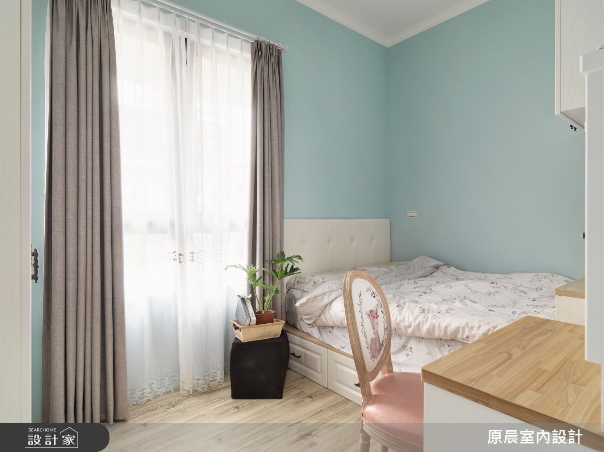 主臥回歸單純的睡眠機能,大面窗景與透光簾幕挹注室內好採光,而天藍色的漆面帶來柔和浪漫的休息氣氛,再安排基礎的梳化、閱讀書桌規劃,滿足私領域的基礎需求。