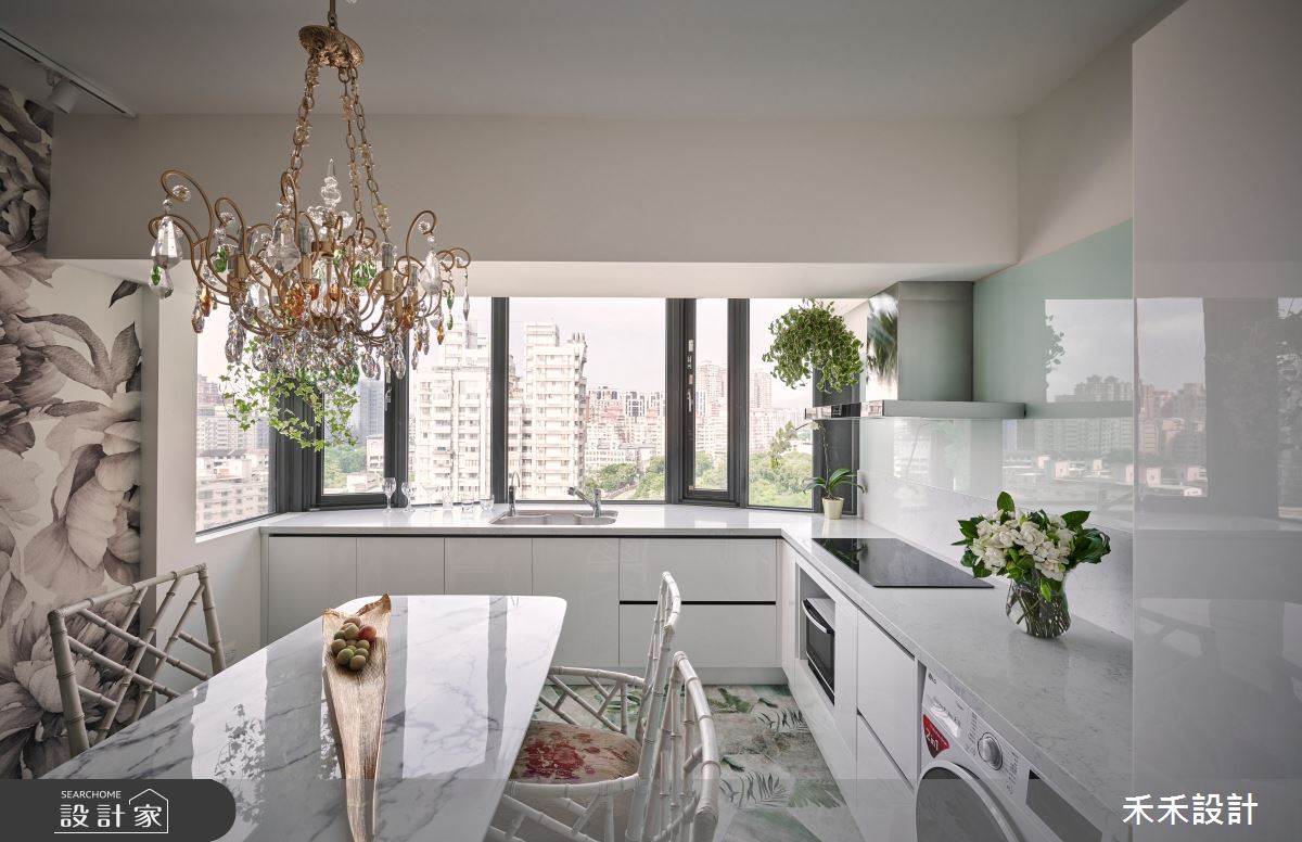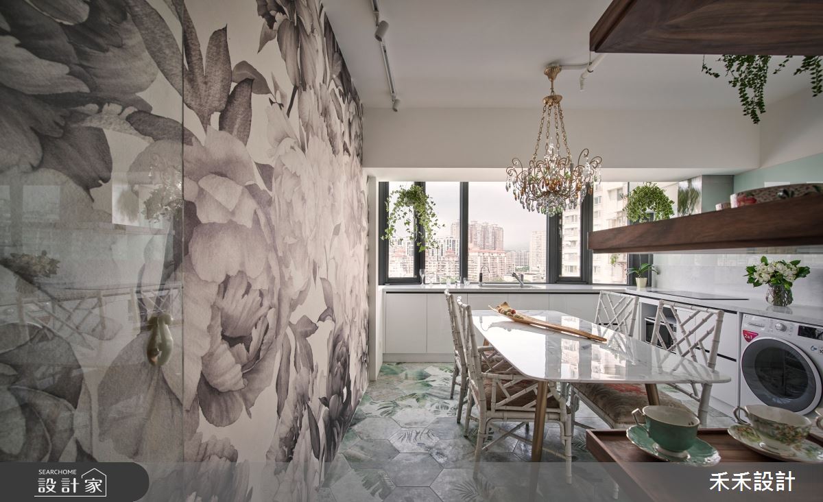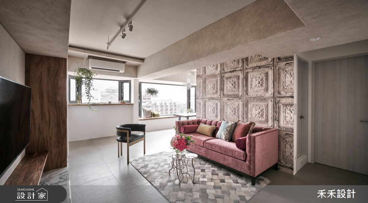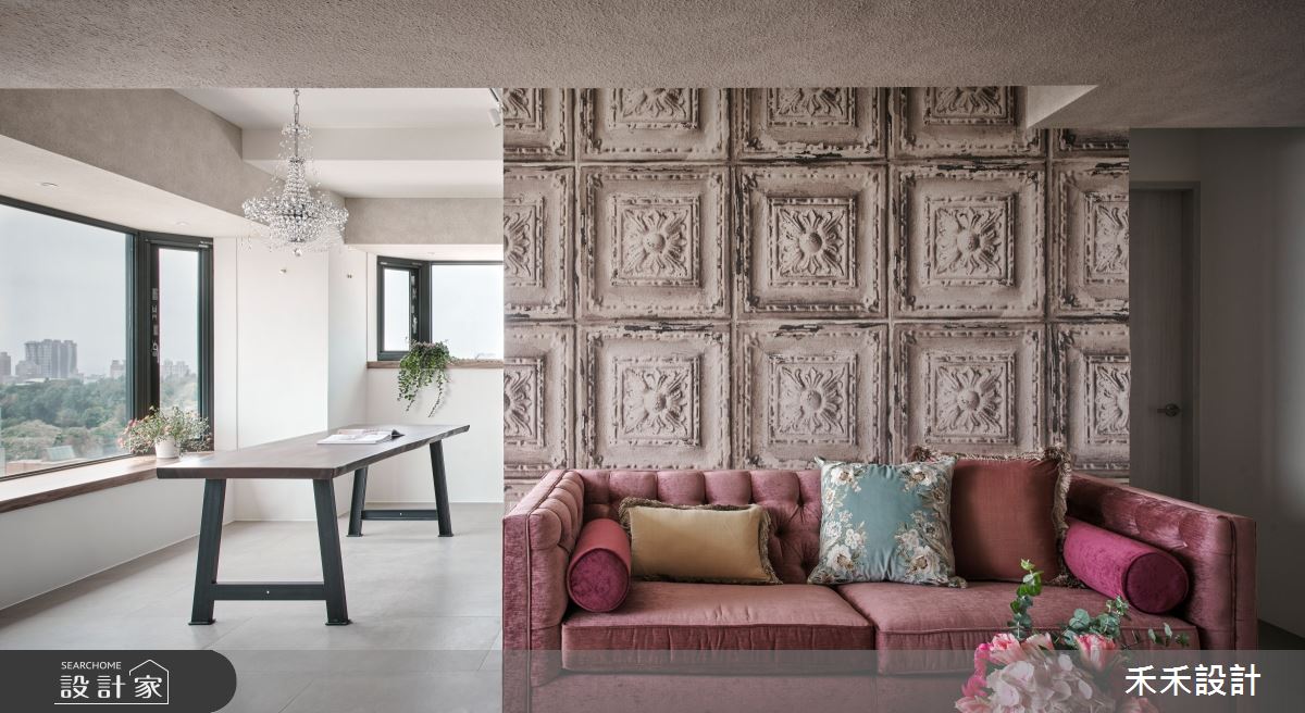 客廳空間,以具有歐洲古堡氣息的沙發牆壁紙作為華麗開場,與粗獷的天地壁形成呼應,沙發則選用鮮豔的亮桃色,搭配黑白灰色系地毯帶出奢華感,電視牆衝突地給予日式木質元素,展現簡單含蓄的層次感;並保留光照充裕的區段作為書房場域,以大面開窗為空間引景,搭配吊掛的綠意植栽,替閱讀氛圍點染無限詩意,窗邊一隅打造而成的臥榻區,則成了絕佳的觀景休憩之所;餐廳區帶入些許鄉村氣息,以立體、誇張的壁紙做大面積鋪敘,帶來豐富且充滿張力的生命力量,同時烘托水晶吊燈的璀璨質韻!