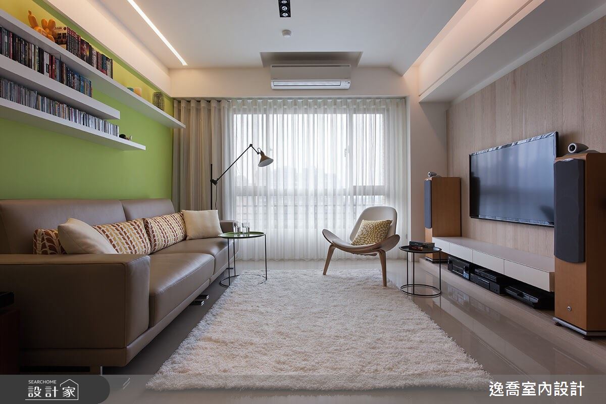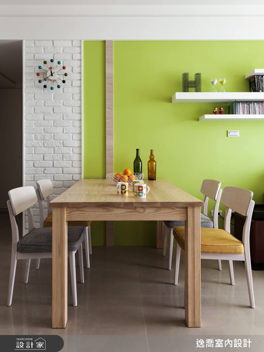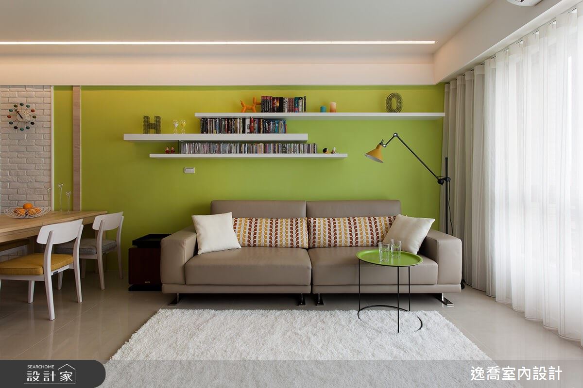 採光充沛的 30 坪中古屋,室內明亮氣氛放鬆,已擁有舒適居家生活的首要條件,於是設計師刷上奇異果般清爽綠漆、輕木質家具強化敞亮優勢,創造北歐風居家既視感,並觀察到屋主藏書量相當豐富,同時擁有收藏公仔的嗜好,便讓收納設計成為中古屋翻新的第二重點。