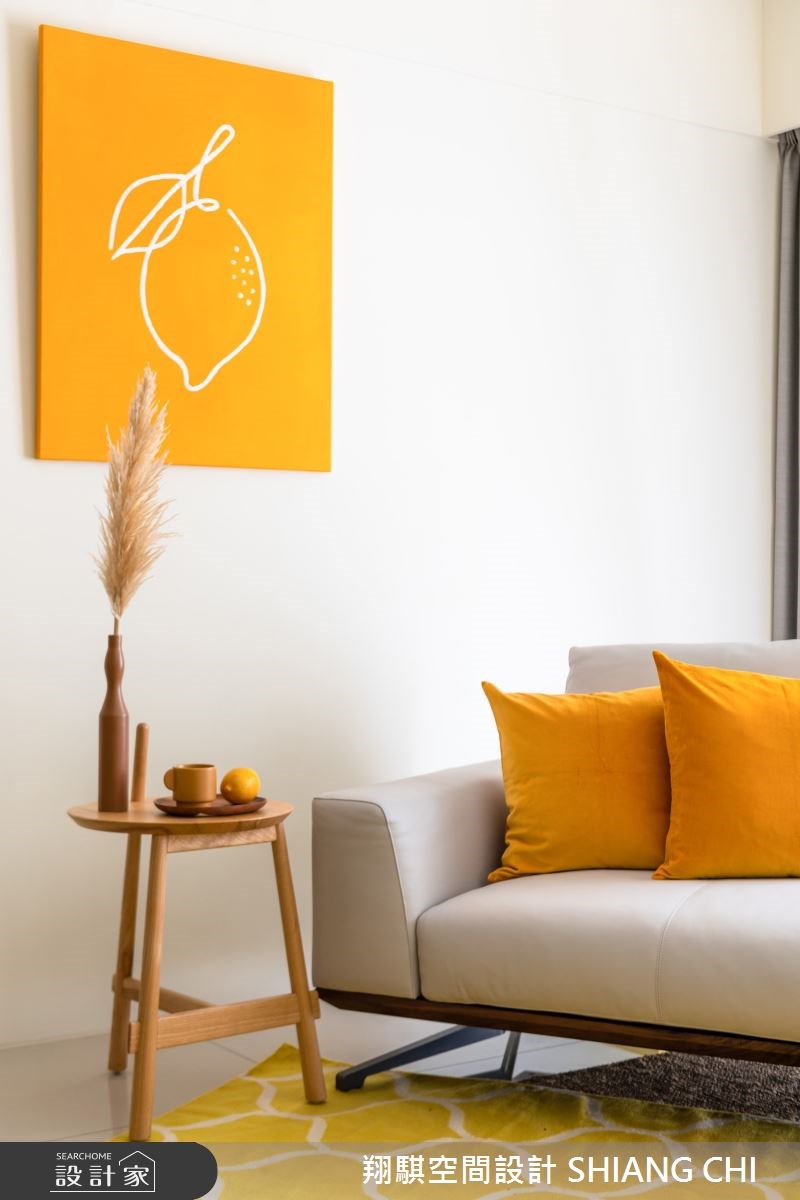 33坪北歐風住宅,以純白色系與溫潤木質交織,形塑清新爽朗的自然氛圍,並適時以活潑跳躍的「柳橙黃」妝點,詮釋空間的趣味感,同時帶來一絲甜蜜北歐風氣息,賦予全家人獨一無二的幸福感受。 整體格局採開放式設計,將客、餐廳兩處連結,打造寬敞舒適的居家視野,而偌大的落地窗則引入明亮採光,與淺色木地板一同打造暖洋洋的慵懶情境。