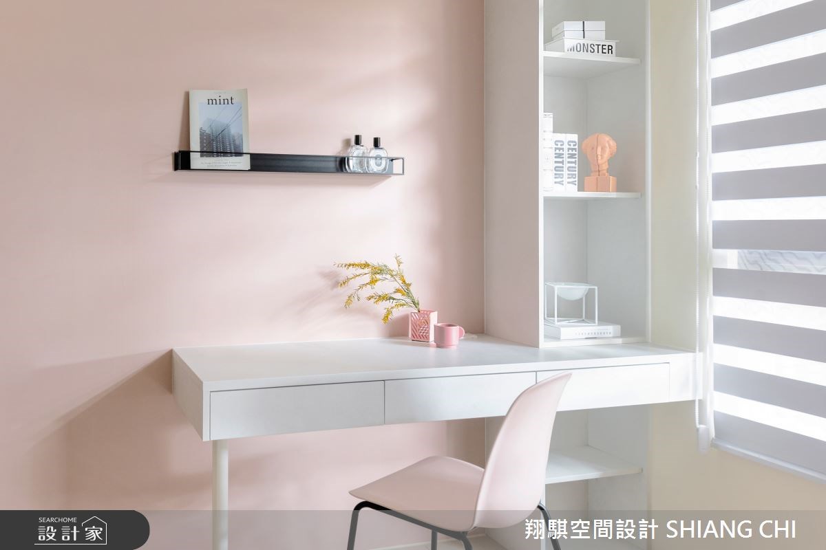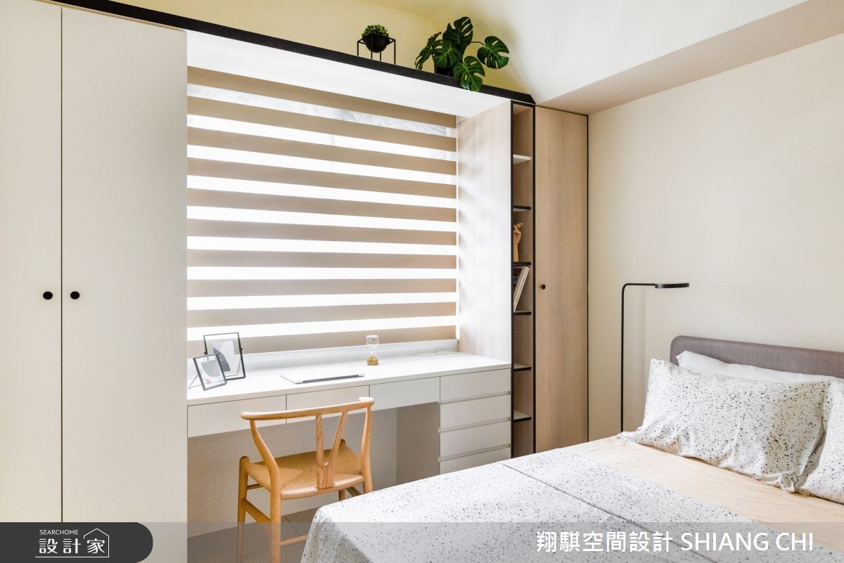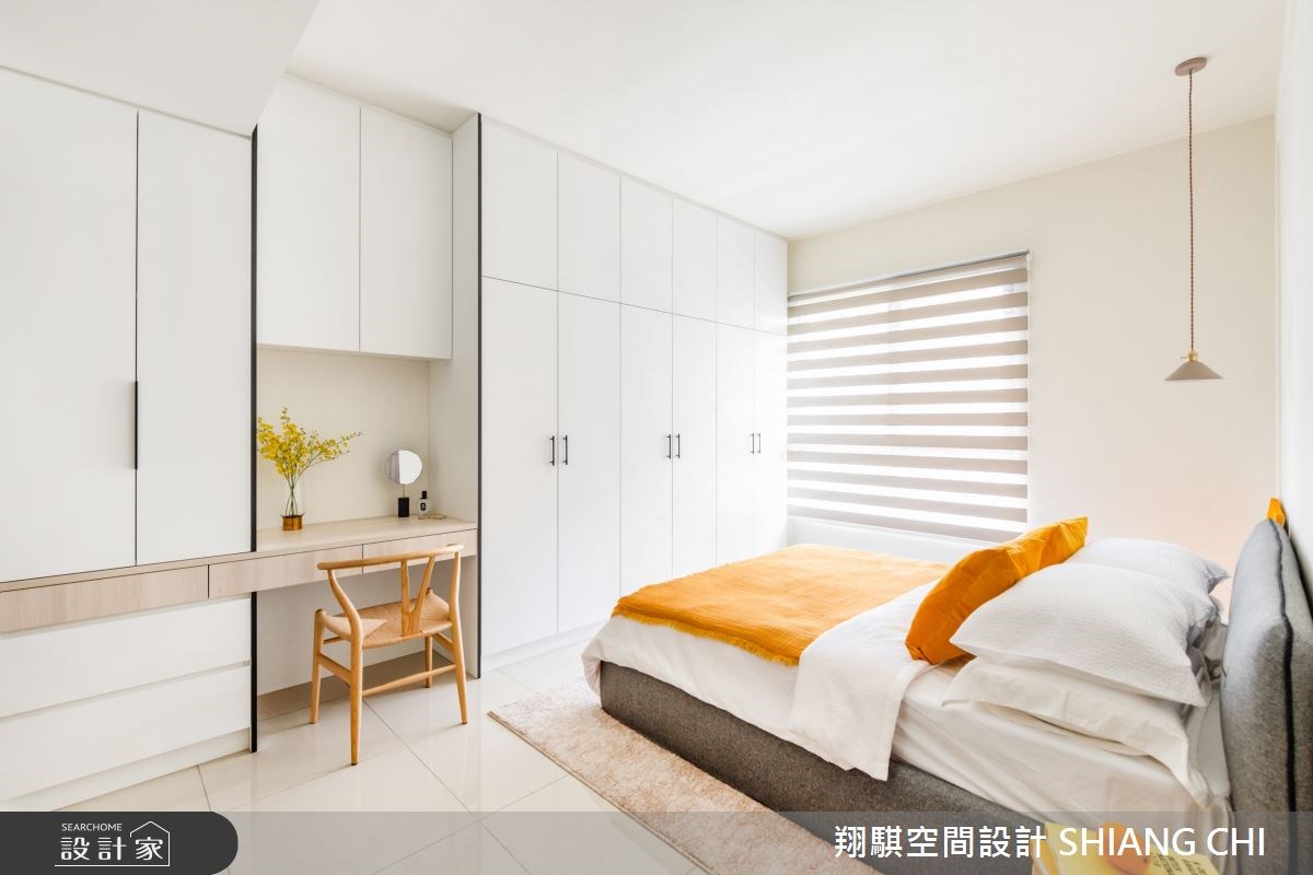 主臥區域,延續公領域的視覺特色,並將梳妝台與牆面融為一體,更打造海量般的衣櫥空間,兼顧機能與視覺美感。