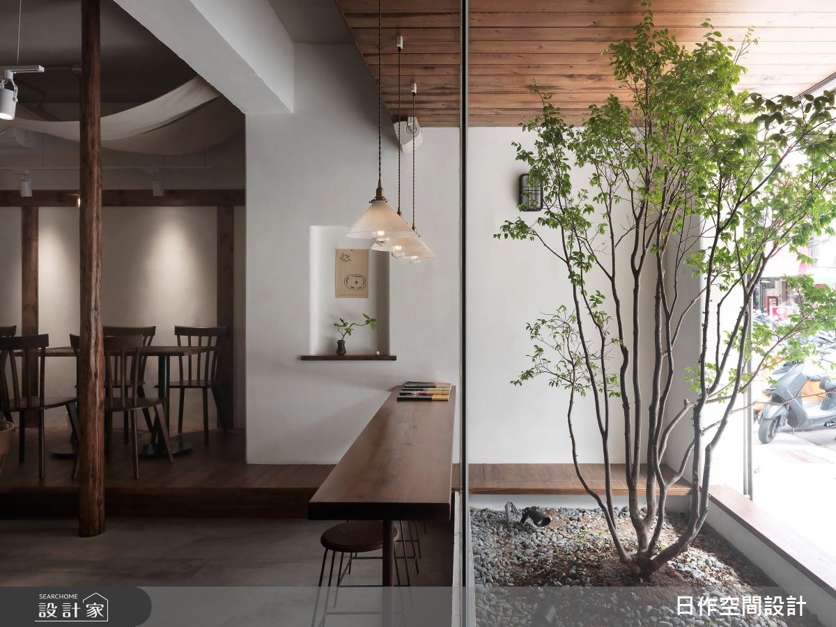 日式漢堡わくわく擁有都會區內難得的內庭院景觀,一個人也能自在舒服的吧檯座位區,除了營造有如置身自然的愜意用餐氛圍,吧檯桌面高度也刻意稍微下降,避免視線遮擋、讓室內座位同樣可欣賞樹景,一來高度的調整也是希望能給予客人安全感。(WakuWaku Burger/空間設計:日作空間設計)