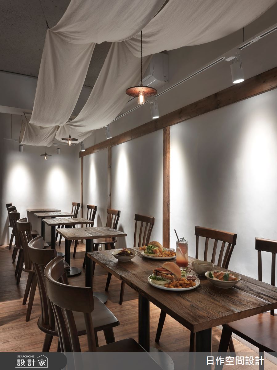 不同於圓桌與兩人沙發區,設計師利用架高地板、輔以布幔元素,規劃出看似獨立卻又開放的座位形式,透過座位的高度、角度設計錯開視線的尷尬,試圖維持客人們的隱私,一方面也提供併桌的彈性需求,創造宛如包廂般的效果。(WakuWaku Burger/空間設計:日作空間設計)