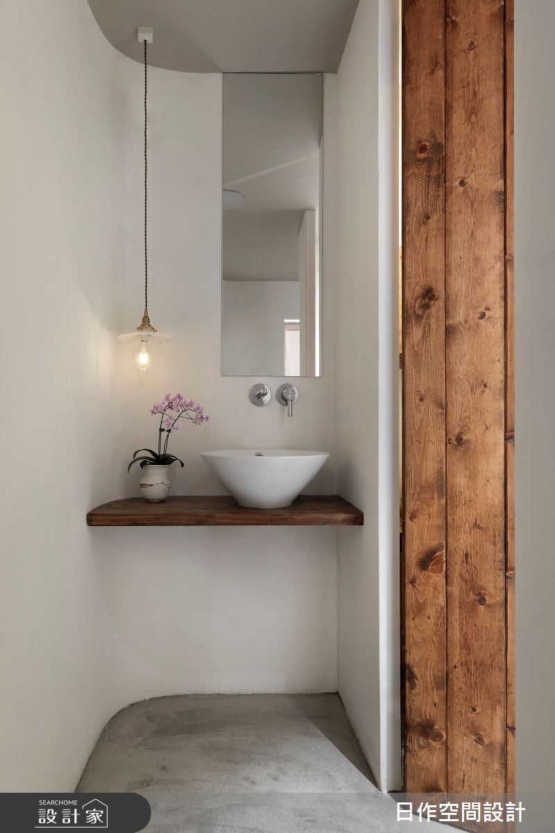 順著白色弧形牆面往內走,巧妙地將洗手間予以包覆,藉由優雅的弧形線條,讓等待洗手間的尷尬與不自在感化為無形,並增加洗手檯面的配置,等待時可稍作妝容整理,一來也是讓客人在享用漢堡之前能洗手,裡外各自有獨立的檯面足以使用,更為從容。(WakuWaku Burger/空間設計:日作空間設計)