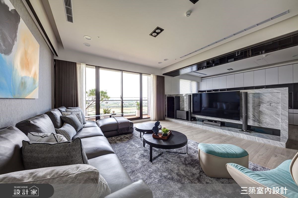 帶著低調奢華設計的現代風住宅裡,因為陽台的一抹綠意讓56坪的空間不僅視覺上更寬敞,還多了一抹清新氣息。室內空間運用大量現代建材建構屋主期盼的微奢華風格。玄關石材拼花與卡拉拉白紋大理石電視牆鋪陳空間的現代與華麗,點綴的鐵件與鏡面勾勒住宅輪廓使風格更為鮮明;淺色超耐磨木地板則柔化現代風空間的銳利,襯托屋內材質拼接的細膩設計。