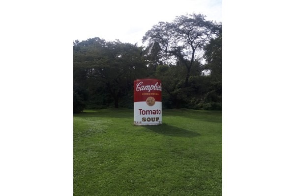 是的,他可以把偌大的康寶濃湯罐,直接佇立草原上供眾人拍照,外加風吹日曬雨淋;也能同時在這個眾人很容易對藝術產生疏忽的當下,將人氣藝術家草間彌生&奈良美智的作品,隱藏在一片看似什麼都不存在的白牆、或是僅露出一個把手的小房間之後。在在令就此錯過的觀眾直扼腕。