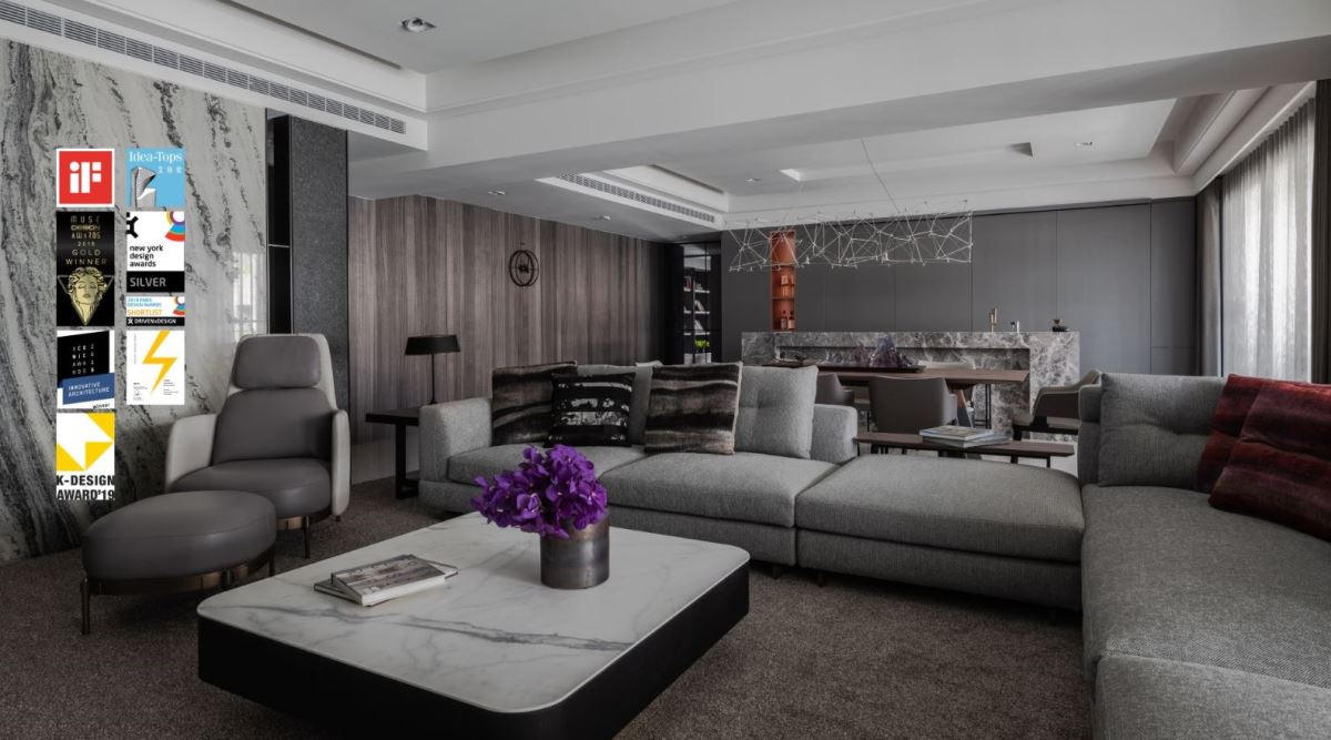 獲獎作品豪宅屋主為一對從海外回台定居的退休族夫婦,期許能擁有自住、聚會兩相宜的生活機能。首先,朱英凱設計師從屋主視角出發,結合設計專業綜觀格局及建築本體,將 100 坪場域備有 5 房 2 廳 4 衛完整格局,公領域更以開放式設定串起客、餐廳及中島吧檯,保持領域間的交流互動,帶來寬闊舒適的生活動線與聚會場域,照顧退休者的使用便利性,並滿足聚會享樂需求。